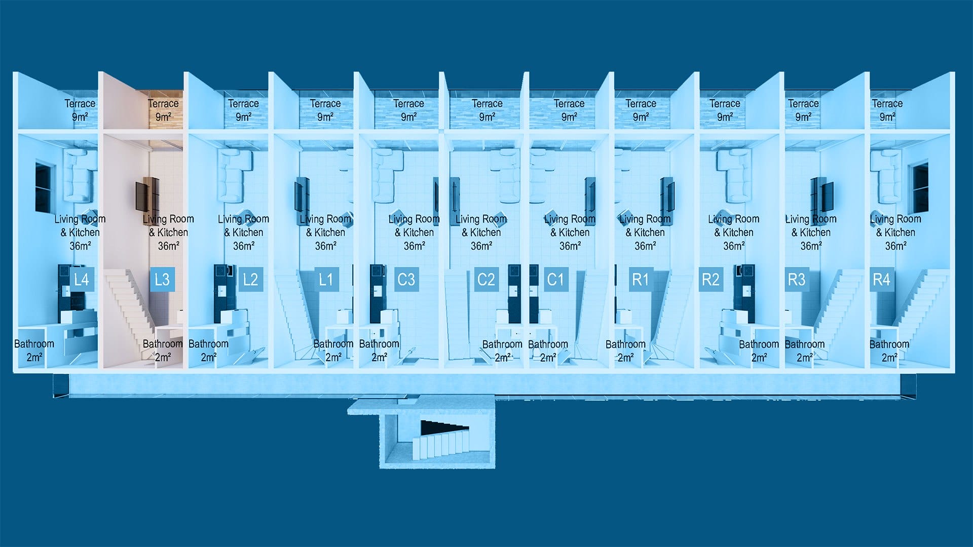 Апартаментът с площ 67 кв.м. е проектиран с мисъл както за функционалност, така и за естетика. Долното ниво включва: