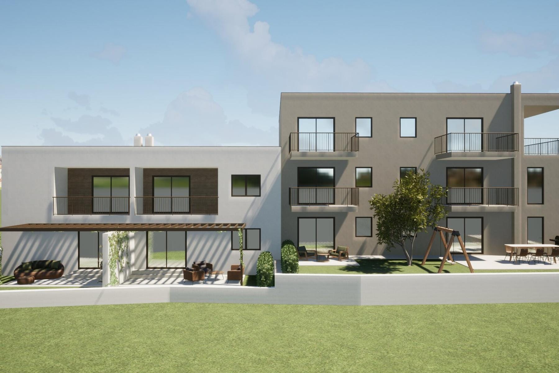 Просторната дневна зона включва отворена кухня с трапезария и хол, свързан с тераса и балкон, което позволява лесно организиране на място за отдих и социални срещи. Спалните са удобни, а една от тях разполага със собствена баня и излаз към балкон, което повишава комфорта при ползване. Проектът предвижда хармонично съчетание между удобство и модерен дизайн, който отлично се вписва в пейзажа на региона.