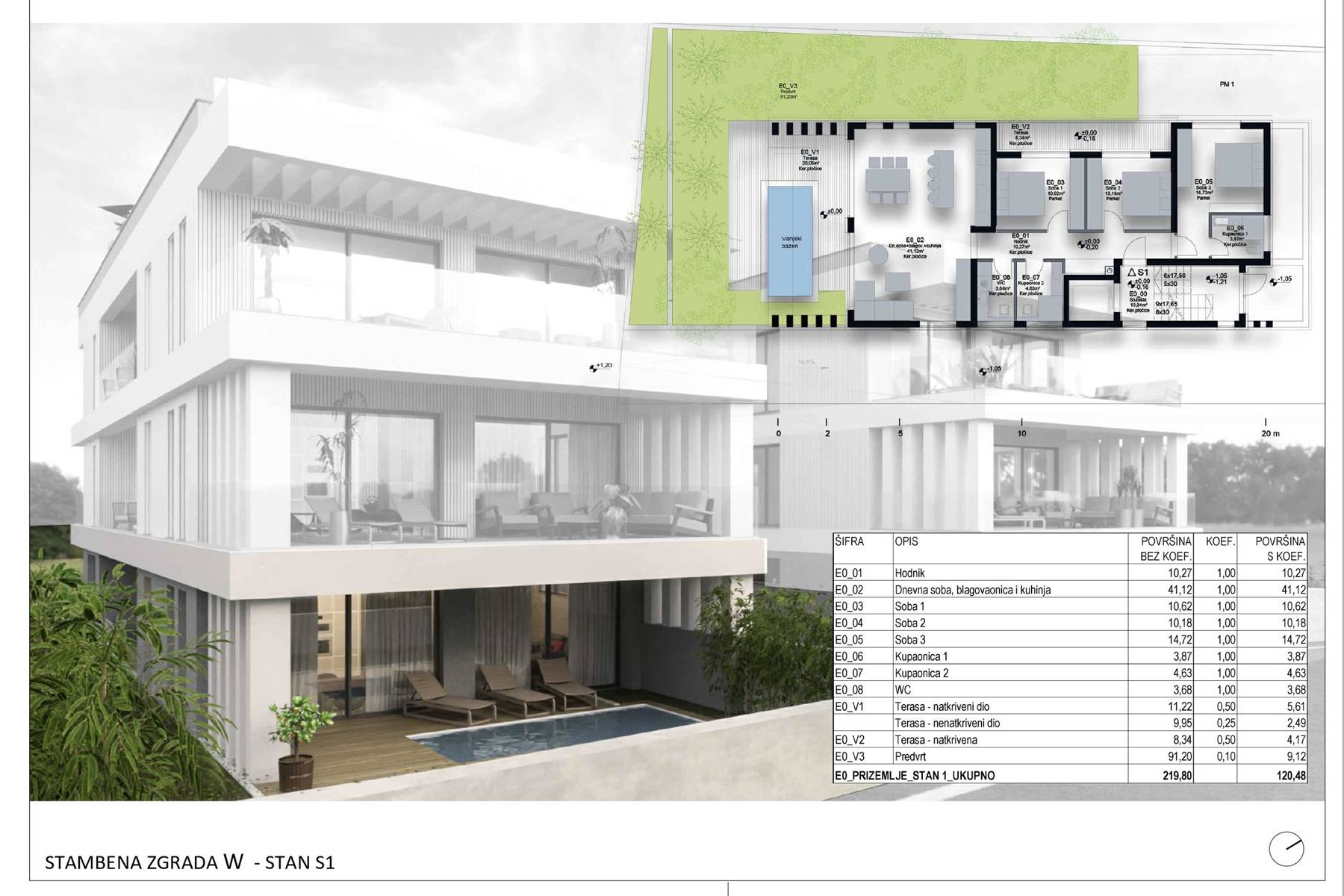 Представеният апартамент се отличава с голяма площ и висок стандарт на завършване. Намира се в спокойна, живописна местност близо до Задар, което го прави отлична оферта за хора, които ценят комфорта и природата. Жилището е разположено на партерен етаж, което улеснява достъпа и позволява ползването на просторната градина. Функционалното разпределение на помещенията осигурява удобен живот както за семейства, така и за хора, които ценят пространство за отдих.