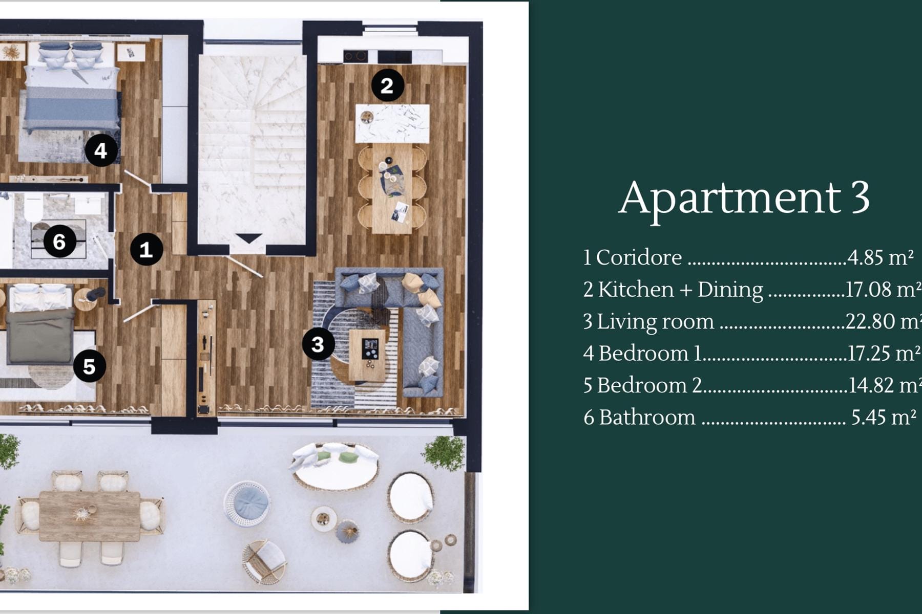 Апартаментът с площ от 124,87 м² съчетава функционалност и простор. Полезната жилищна площ е цели 82,23 м², а над 40 м² заема голяма, удобна тераса. В състава на имота влизат кухня с трапезария, уютен хол, две спални и баня. Цялото помещение е обзаведено с внимание към детайла и естетиката, което го прави отлично място за живеене или почивка.