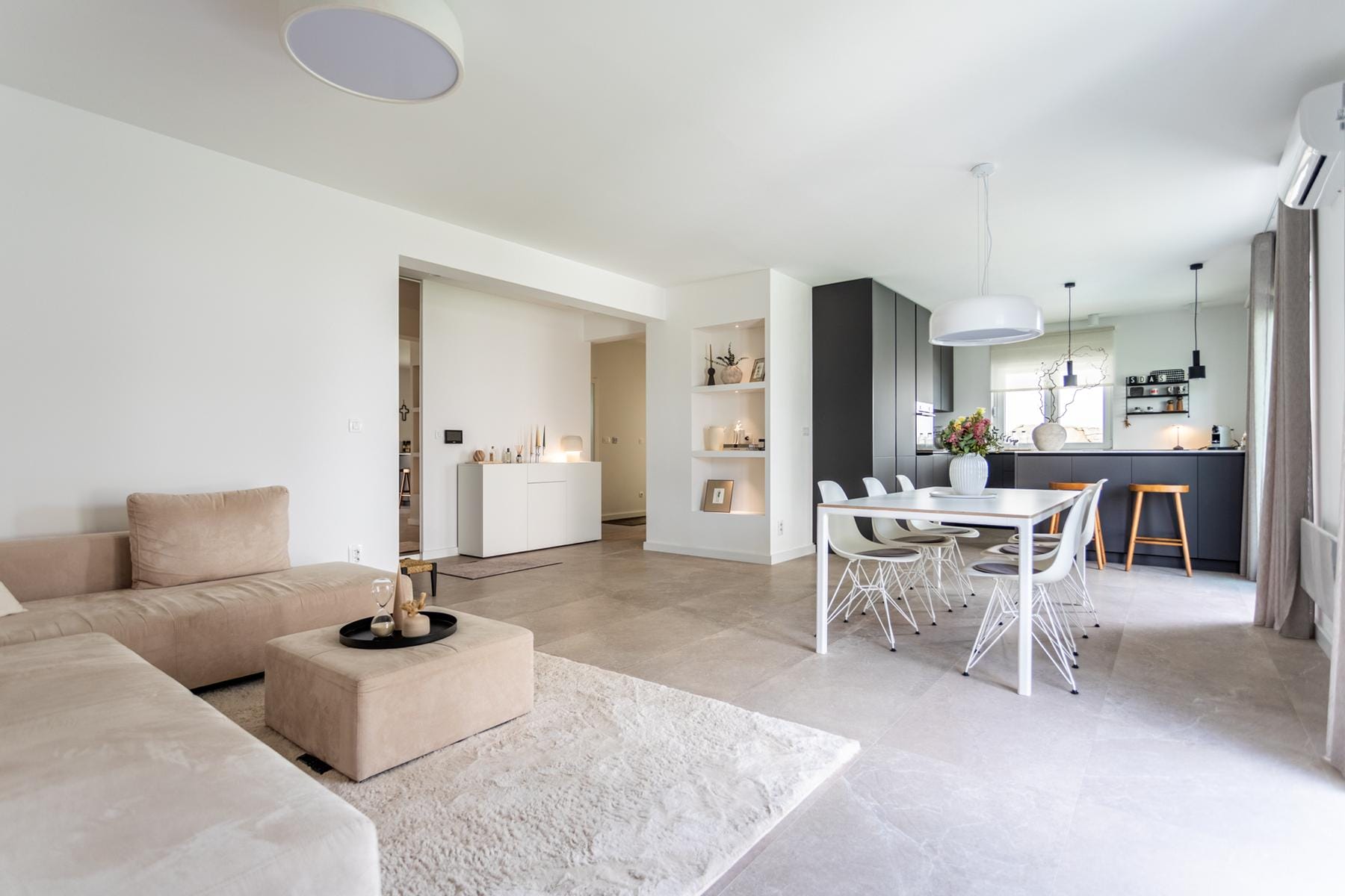 Жилищното пространство е проектирано по много практичен и модерен начин. Холът с отворена кухня създава голяма дневна зона, която насърчава прекарването на време със семейството или приятели. От всяка стая има изход към градината, което значително разширява възможностите за отдих и почивка. Градината осигурява място за релакс на открито и възможност за оформяне на зелено пространство според личния вкус.