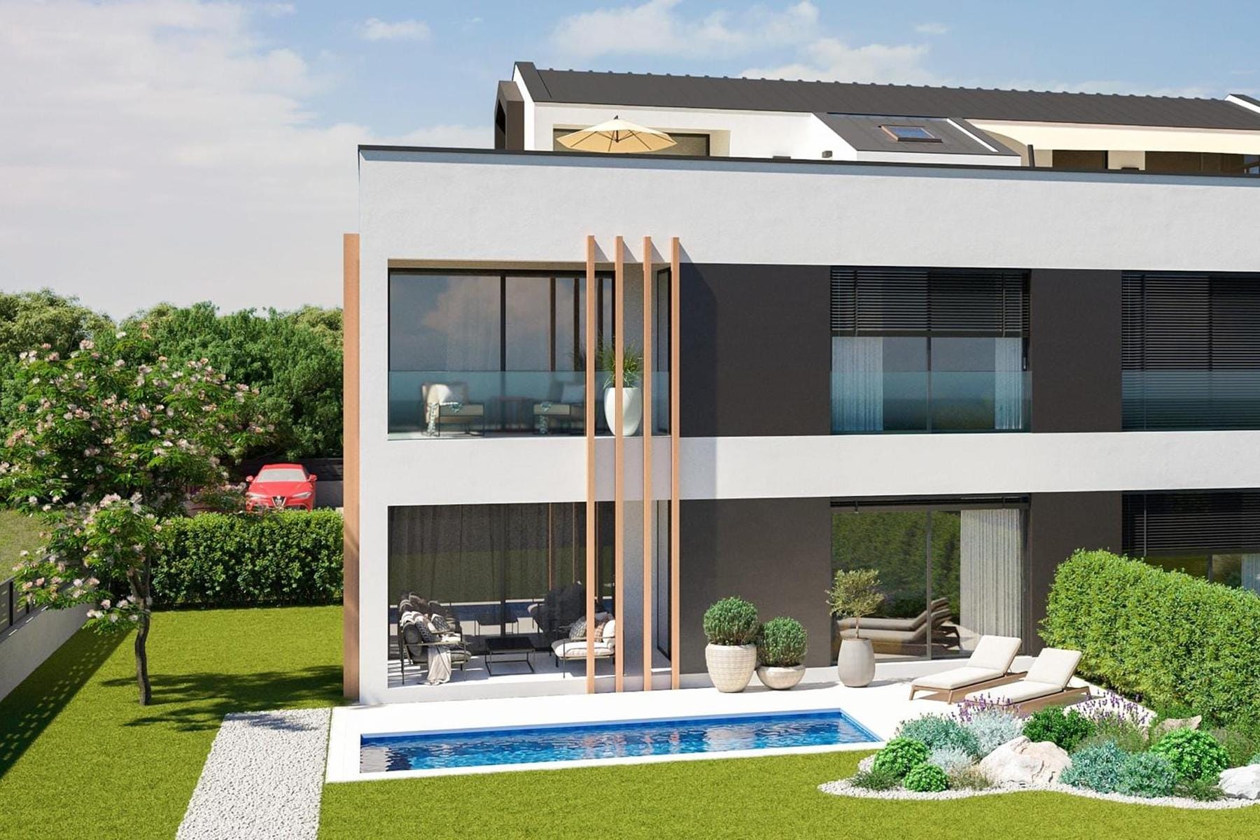 Имотът се намира в красивия Ровин, на полуостров Истрия, известен със своята изключителна красота и климат, благоприятстващ почивката. Апартаментът, разположен на партерния етаж на сграда, съчетава модерни решения с комфорт за ежедневието. Пространството е проектирано с мисъл за функционалност и естетика, осигурявайки приятни условия за семейство или за хора, които ценят простор и удобство. Предимство е не само близостта до морето, но и собствената градина, идеална за релакс и прекарване на време на открито.