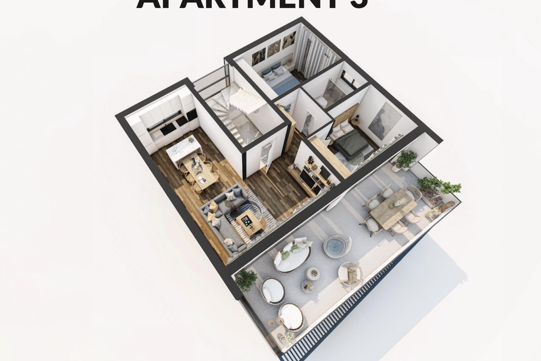 Интериорът е проектиран с мисъл за комфорт и функционалност. Включва просторна кухня, свързана с трапезария, уютна дневна и две спални, идеални както за семейства, така и за хора, търсещи самостоятелно пространство. Цялостта се допълва от елегантна баня и обширна, защитена тераса, позволяваща релакс на открито през цялата година.
