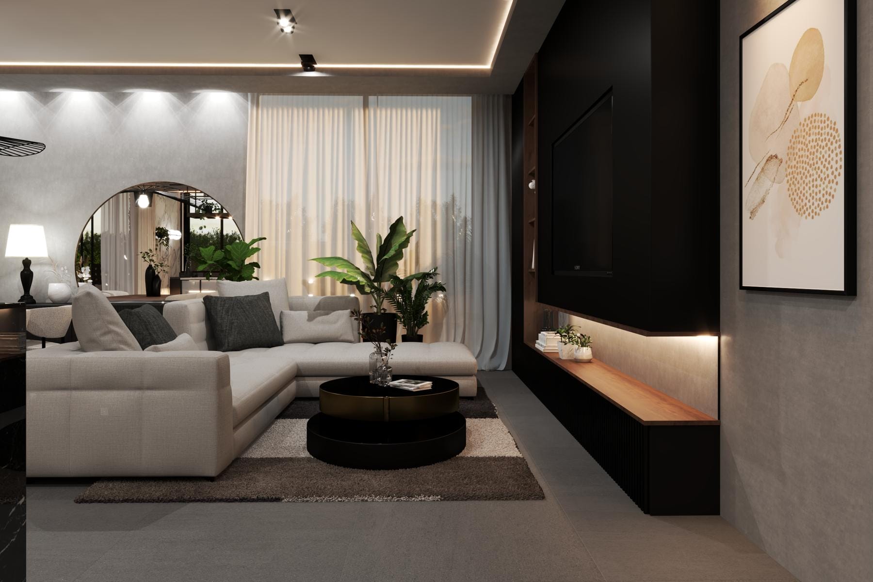 Интериорът включва просторна дневна, свързана с трапезария и кухня, които са ясно отделени и създават цялостна, комфортна дневна зона. Освен това апартаментът разполага с гардеробна и стопанско помещение, което улеснява организацията на пространството. Заслужава внимание входното антре и мезонетът, които придават лекота и елегантност на пространството.