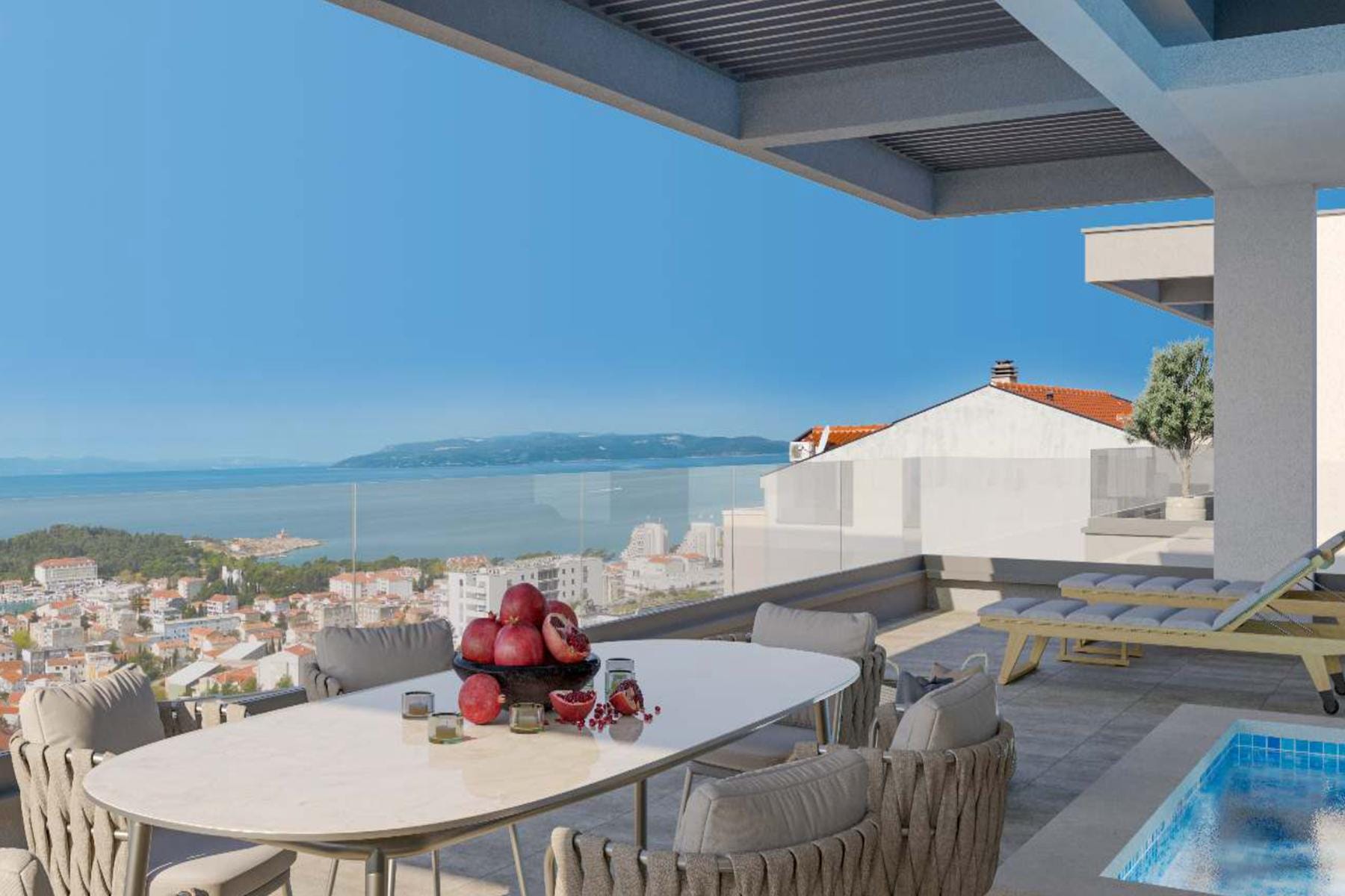 В сърцето на живописното крайбрежие на Далмация се намира изключителен имот, предлагащ лукс и комфорт на най-високо ниво. Апартаментът заема цялото последно етаж на модерна жилищна сграда, която е в процес на изграждане. Това просторно жилище съчетава функционалност с елегантност. Светлите интериори, изпълнени с естествена светлина, както и внимателно проектираната разпределение на помещенията създават топла и приятелска атмосфера.