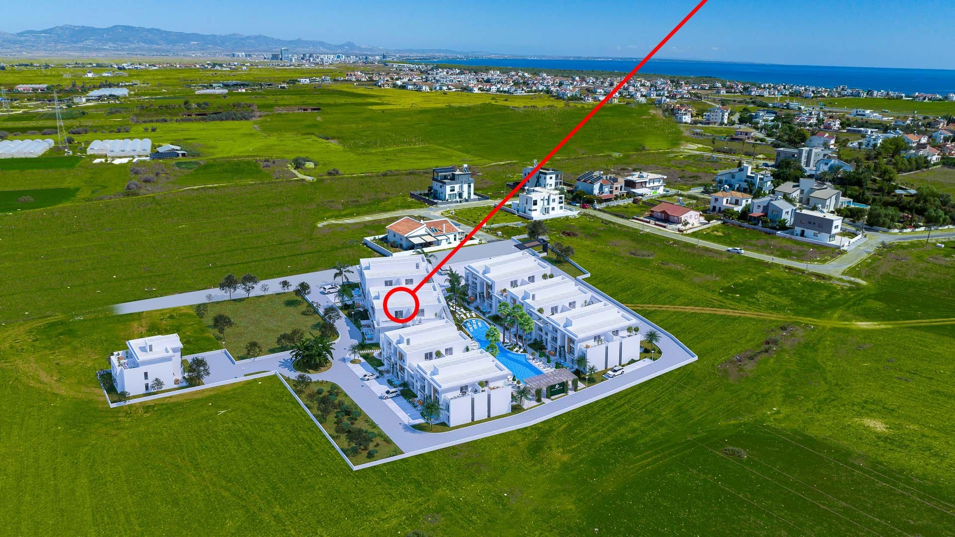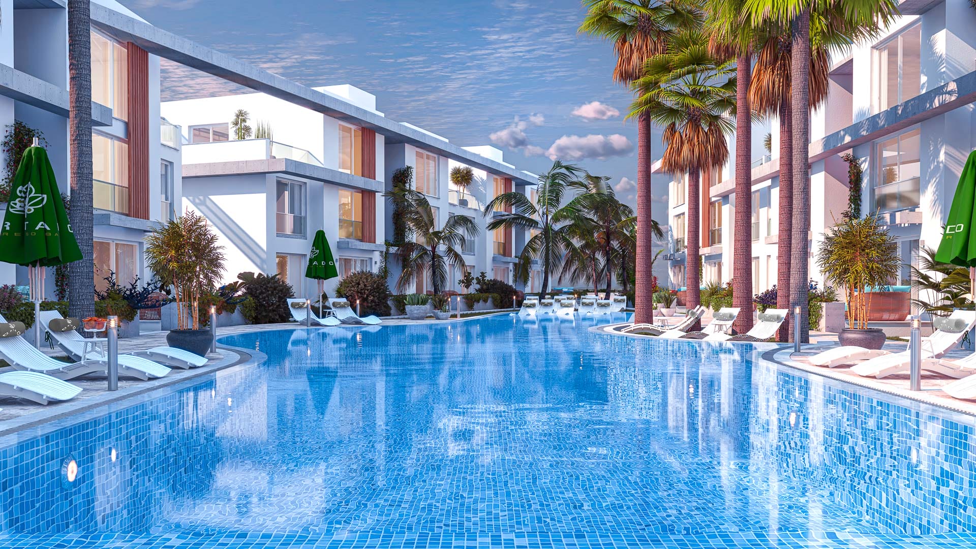 Модерните апартаменти в Йени, Северен Кипър, предлагат удобен достъп до административни учреждения, плажове и развлекателни обекти. Плажовете Кочарейс и Йенибогазъчи са само на 4 минути път от комплекса, а плаж Лонг Бийч – идеален за активна почивка – се намира на 7 минути разстояние. Близостта до горите Саламис и древния град Саламис предоставя множество възможности за исторически изследвания. Най-близкият град Фамагуста предлага пълна гама услуги – болници и университети – само на 10 минути път с кола.