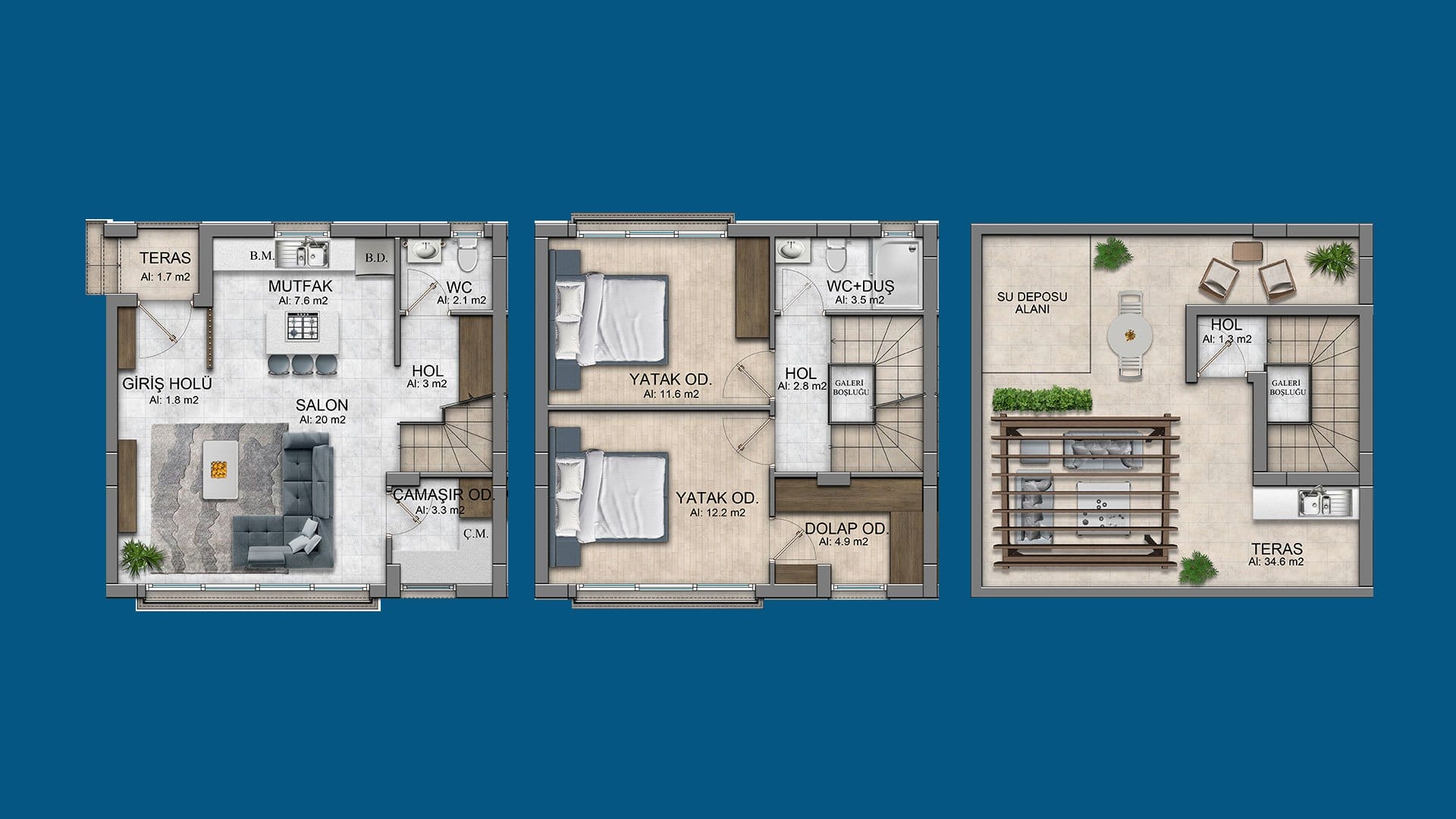 Лофт апартамент тип 2+1 предлага уникален, модерен интериор. С обща площ от 129 м² осигурява както пространство, така и стил. На долното ниво е разположена комбинация от кухня и дневна, създаваща открито, светло пространство, подходящо за готвене и отдих. Това носи функционалност и добавя комфорт към ежедневието. Не липсва баня и малка тераса с площ 1,7 м², идеална за момент на релакс с чаша кафе. Горният етаж съдържа две уютни спални и втора баня, което повишава стандарта на жилището. Покривната тераса от 34,6 м² с място за барбекю създава отлични условия за прекарване на време на открито и организиране на партита и семейни събирания. Стилното довършване и добре обмисленото разпределение на пространството осигуряват удобство за живущите тук.