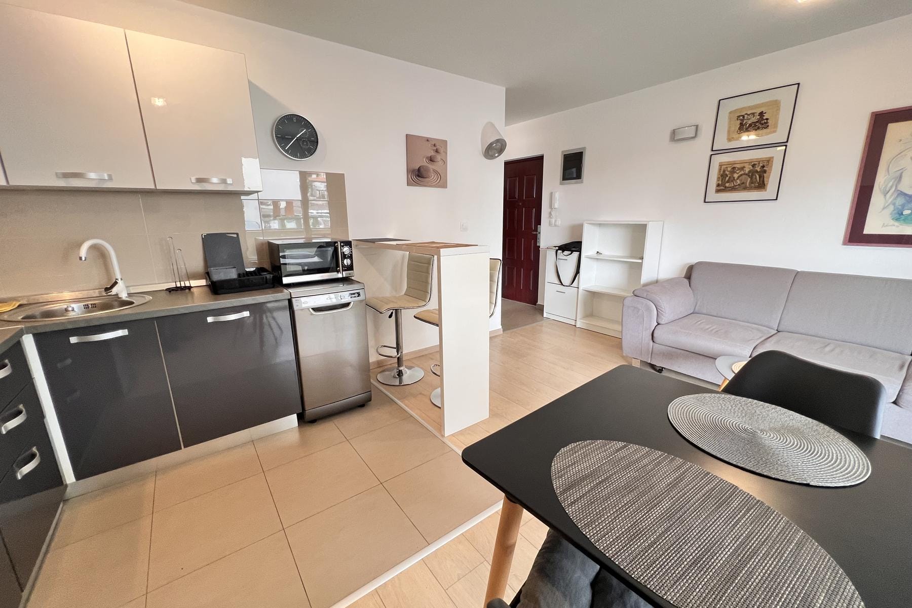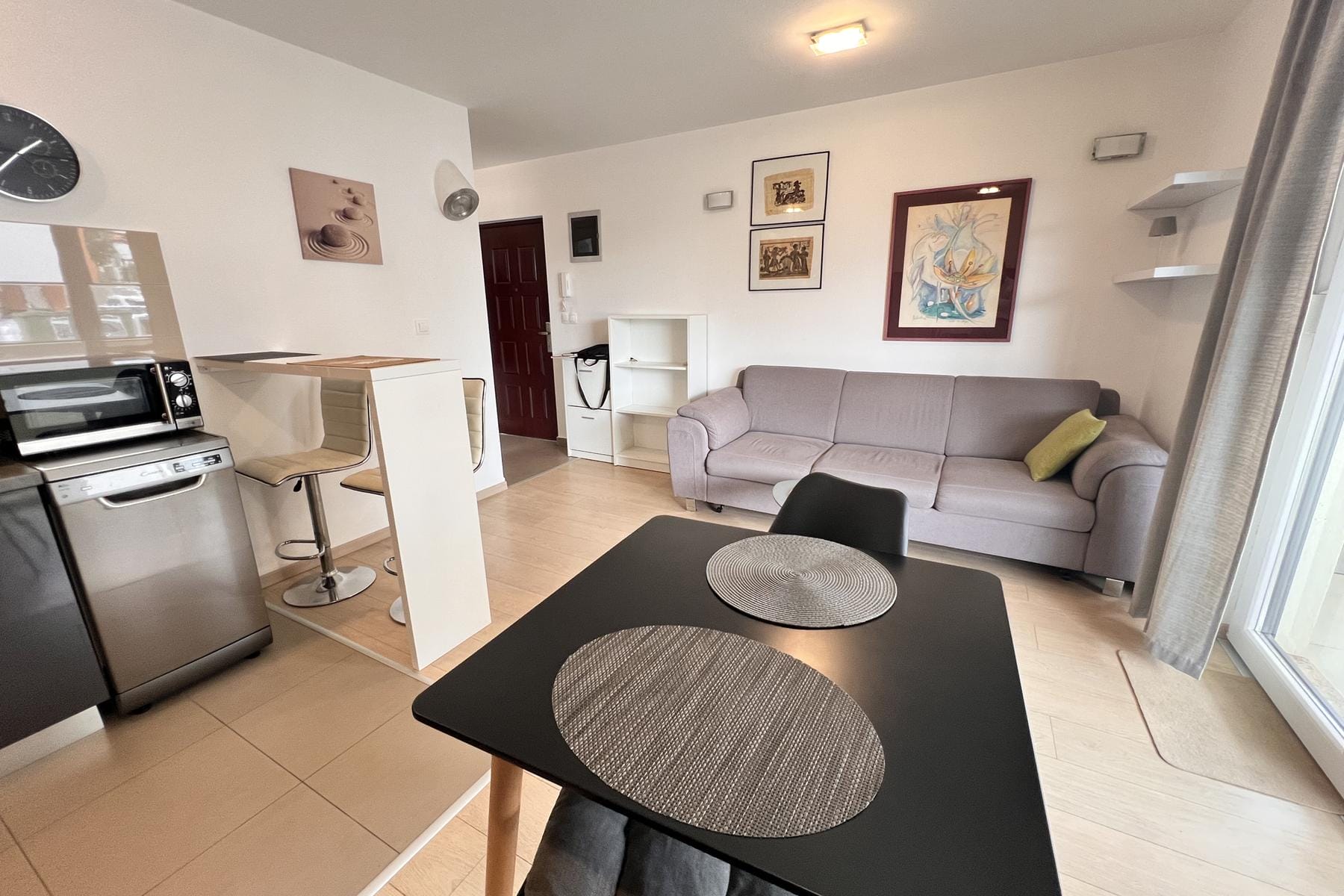 Стъклен изход към терасата осигурява естествена светлина и позволява свободен достъп до свеж въздух. Апартаментът се продава напълно обзаведен, което позволява бързо нанасяне или незабавно отдаване под наем. Допълнително предимство е паркомясто на външен многоетажен паркинг, осигуряващо удобство и сигурност за собствениците на автомобили.