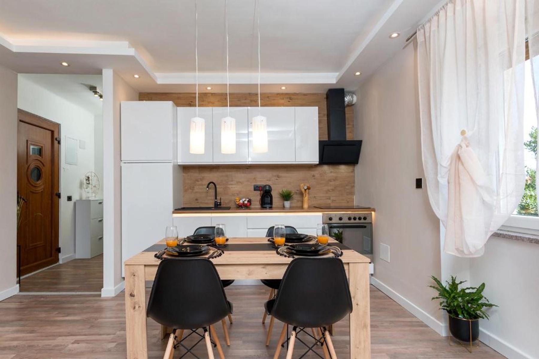 Жилището включва светла спалня, кухня, практично килерче, баня и просторен коридор. Интериорът е проектиран така, че да осигури максимална функционалност и уютна атмосфера. Подовото отопление и климатизацията гарантират термален комфорт през цялата година. Това е идеалното място за хора, които ценят спокойствието, като същевременно имат лесен достъп до градските удобства и туристически атракции, разположено в един от най-красивите кътчета на Хърватия.