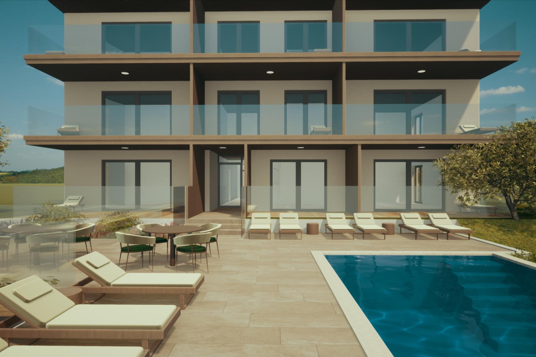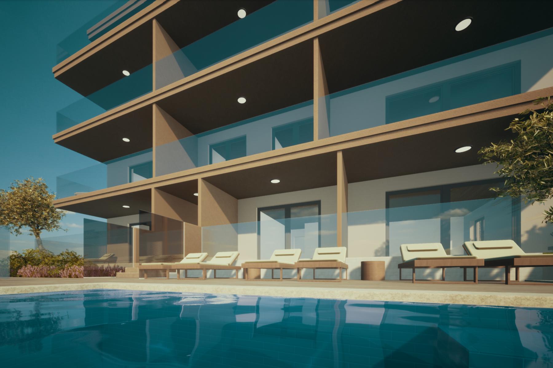 Новоизградената сграда в Примоштен предлага уникална възможност за живот на място, което съчетава съвременност и историческа атмосфера на крайморски град. Апартаментът се намира на първия етаж, откъдето се разкрива обширна гледка към стария град – идеална за любителите на живописни пейзажи и спокойно обкръжение. Сградата има четири етажа и съдържа единадесет апартамента с различна квадратура, което запазва камерния ѝ характер. В общите части е предвиден басейн с размери 12 x 4 метра, който представлява допълнително предимство както в горещите дни, така и за вечерна релаксация.