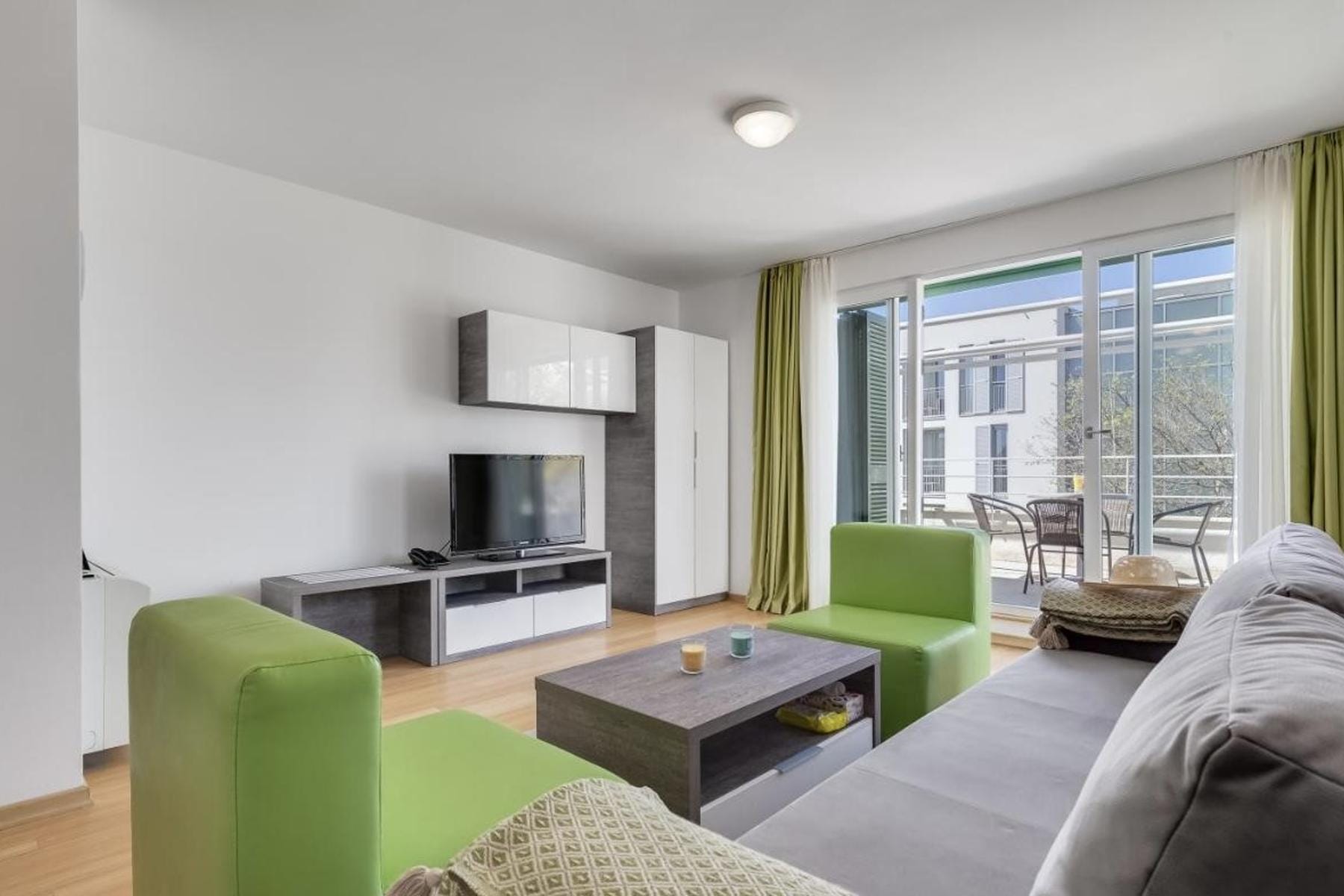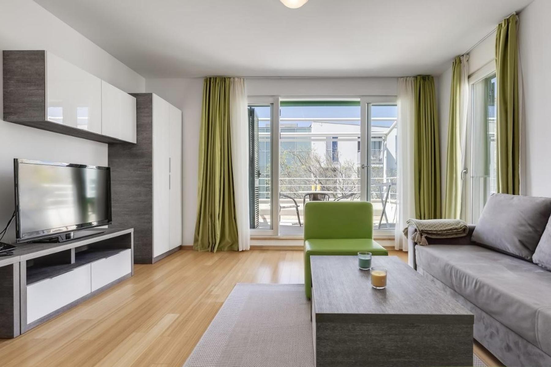 Апартаментът се намира в рамките на модерен курорт край Адриатика. Жилището е с една стая, която включва спална и дневна зона. Цялото се допълва от тераса, от която може да се наслаждавате на околността. Обзавеждането е ново и поддържано в елегантен, функционален стил.