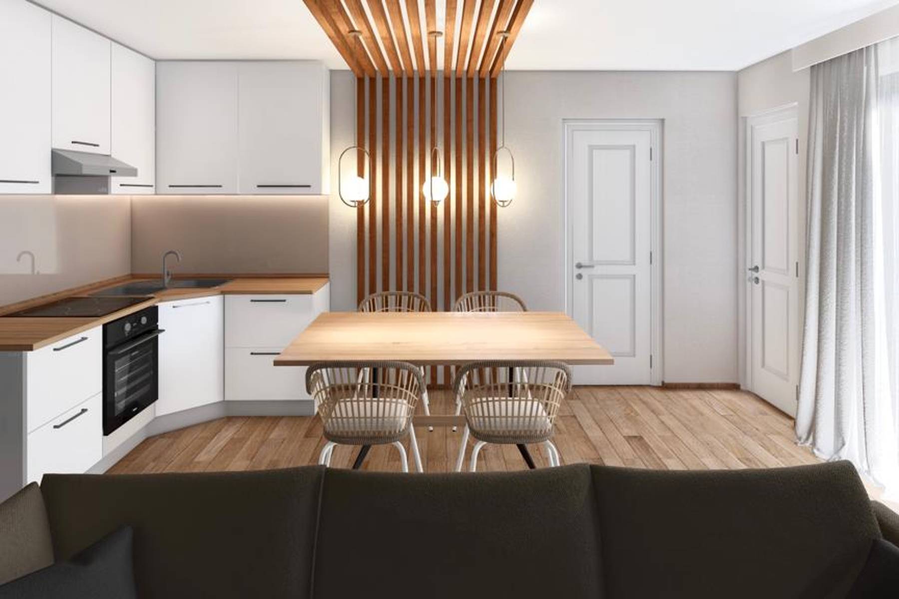 Апартаментът е проектиран с оглед комфорта в ежедневието и естетиката. Големите прозорци осигуряват достатъчно дневна светлина, което прави интериора светъл и приветлив. Отвореното пространство обединява всички дневни функции, което подпомага интеграцията на обитателите и улеснява аранжирането. Допълнително предимство са удобната форма на помещенията и разпределението, благоприятстващо ефективното използване на площта. Сградата се намира в тих район с достъп до местни удобства.
