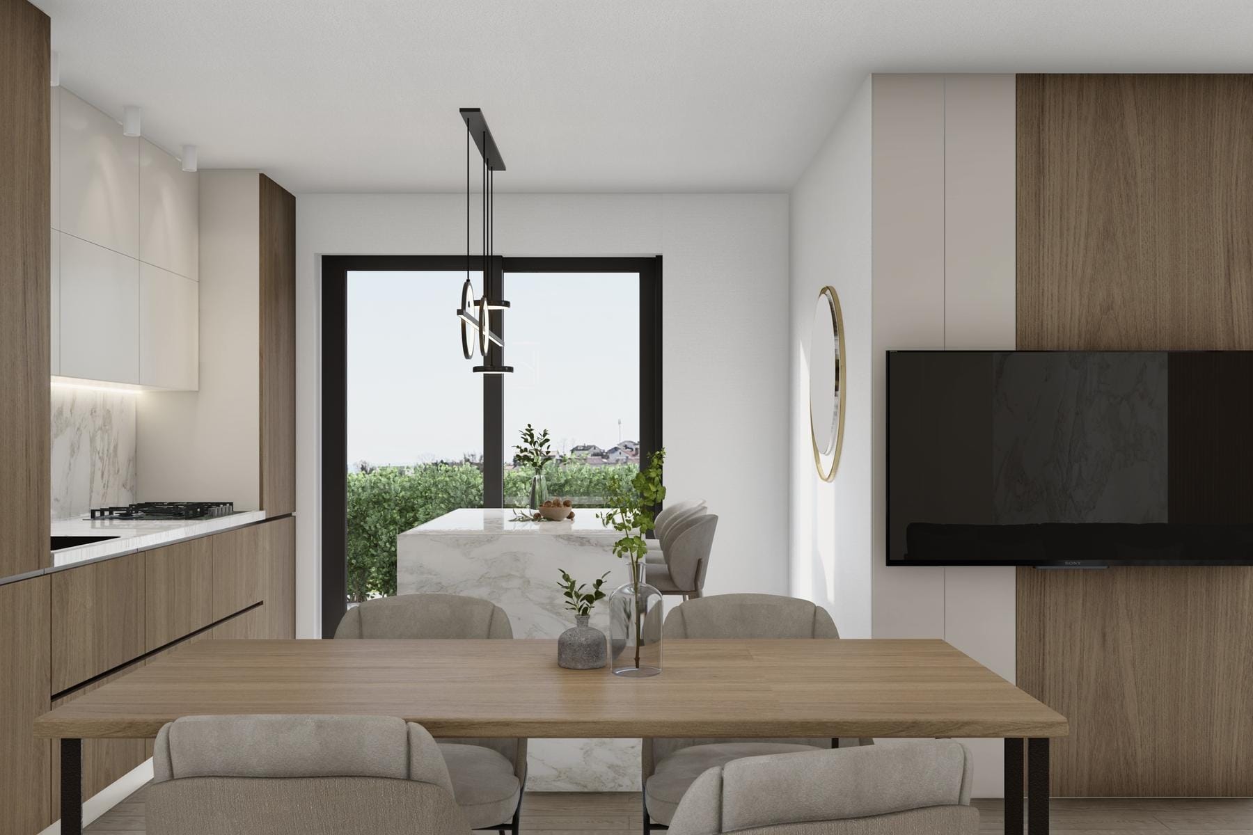 Апартаментът включва отворена дневна зона, в която кухнята, трапезарията и холът образуват хармонично цяло. От тази зона има изход към градината, което позволява лесно ползване на зеленината през по-топлите дни. Във вътрешността има и две спални, което позволява гъвкаво оформление както за семейства, така и за хора, които ценят личното пространство. На разположение е и една баня, отговаряща на нуждите на обитателите. Двуместният паркинг в цената допълва удобството при ползването на имота.