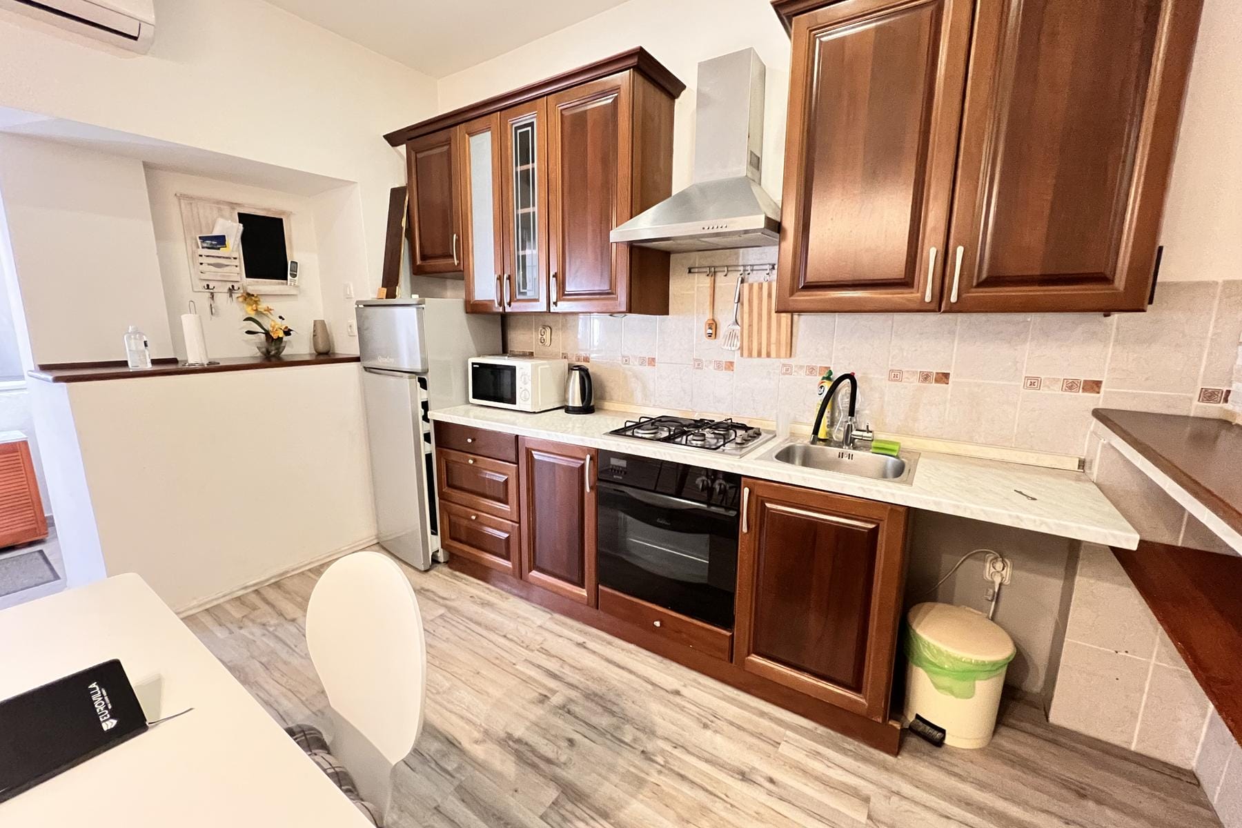 Разпределението на апартамента включва антре, баня, просторна кухня с отворена връзка към трапезарията и дневната. Благодарение на такова планиране всеки метър е използван разумно. Светлите стени и големите прозорци визуално увеличават пространството. Сградата, в която се намира апартаментът, се характеризира с малък брой жители, което допринася за камерна атмосфера.