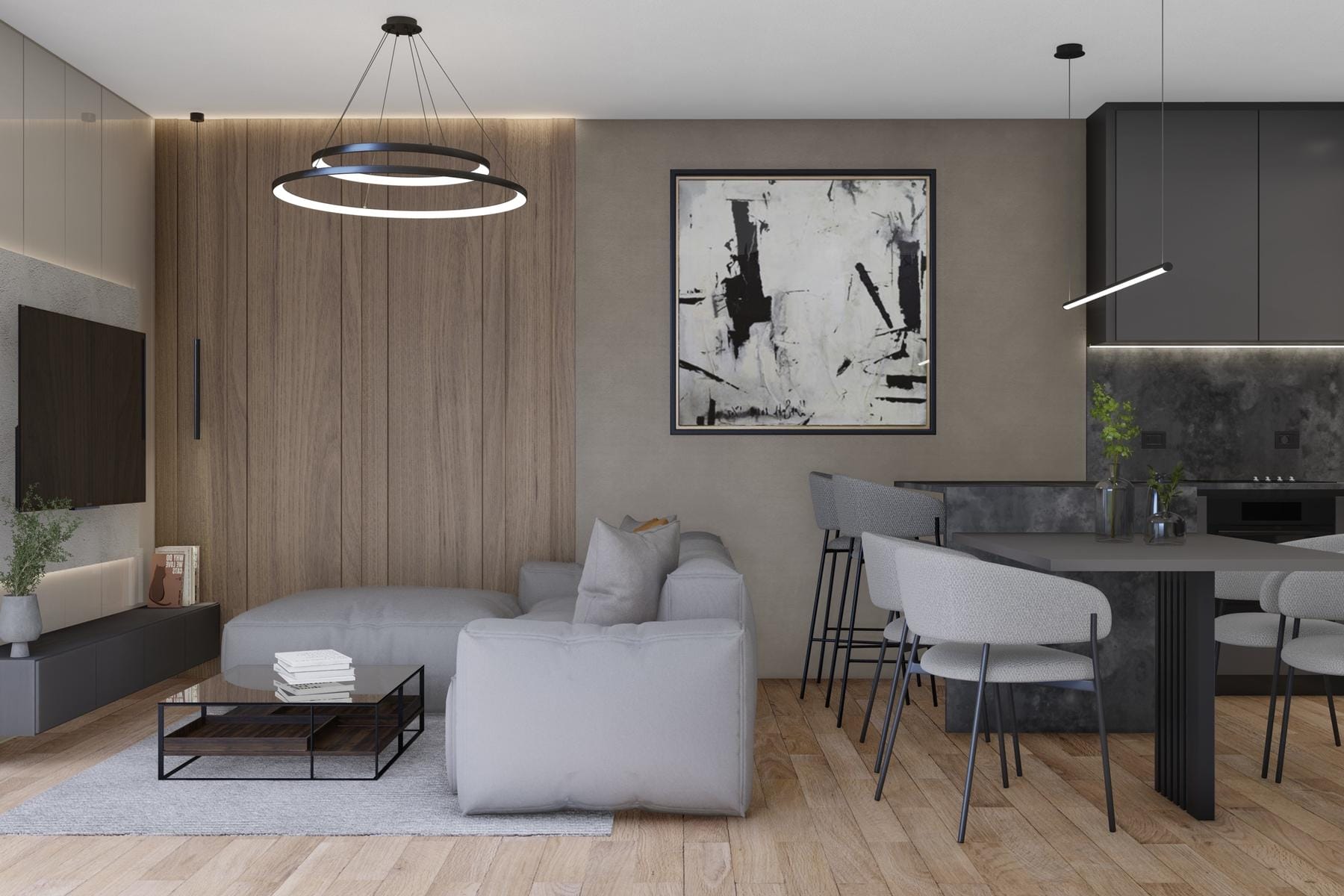 Апартаментът е изработен с внимание към детайла, което се вижда в внимателно подбраните материали и естетиката на интериора. Отвореното пространство, свързващо кухнята и хола, насърчава социализацията и улеснява ежедневното функциониране.