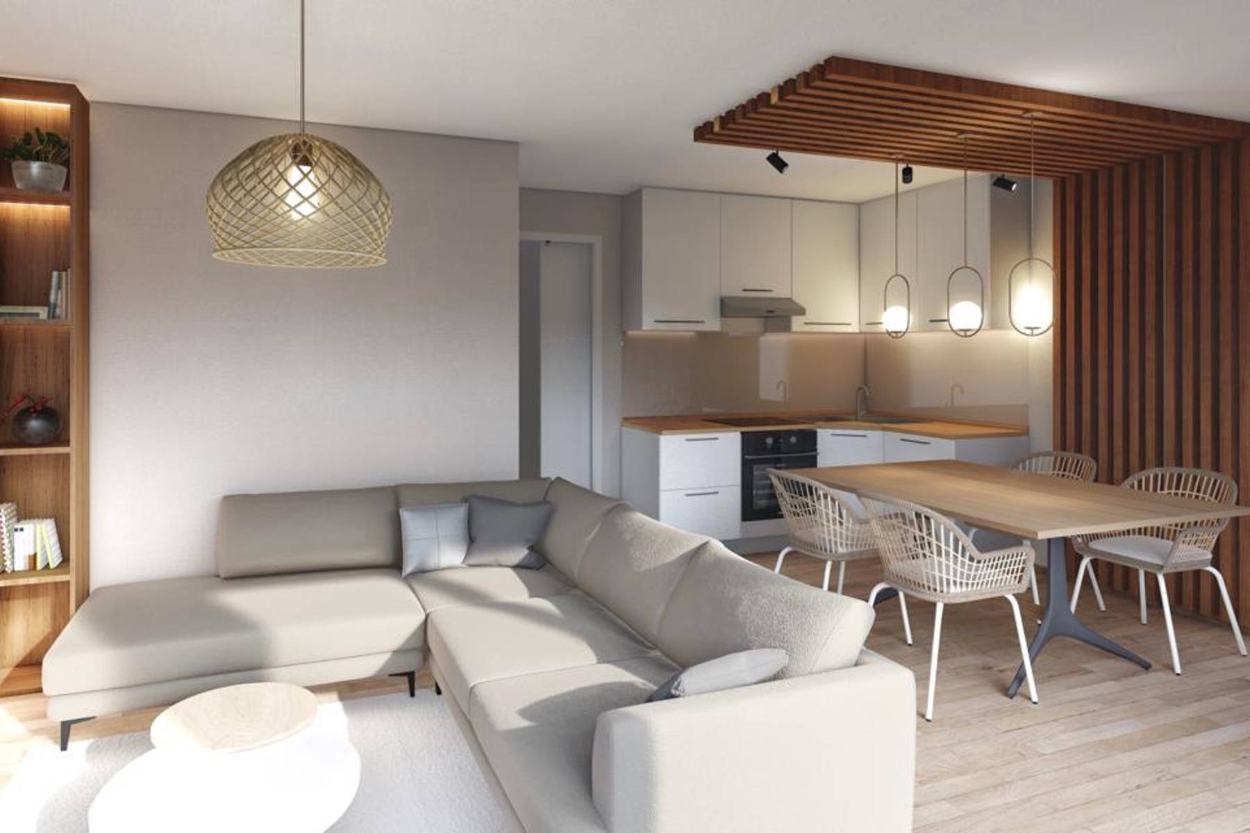 Просторните интериори са планирани така, че да осигурят комфорт в ежедневието. Апартаментът разполага с две удобни стаи, което позволява свободно разпределение на пространството. Отвореното дневно пространство обединява кухнята, хола и трапезарията, позволявайки едновременно съвместно прекарване на времето и релакс. Допълнително предимство е покритата тераса, която позволява отдих на открито през по-голямата част от годината.