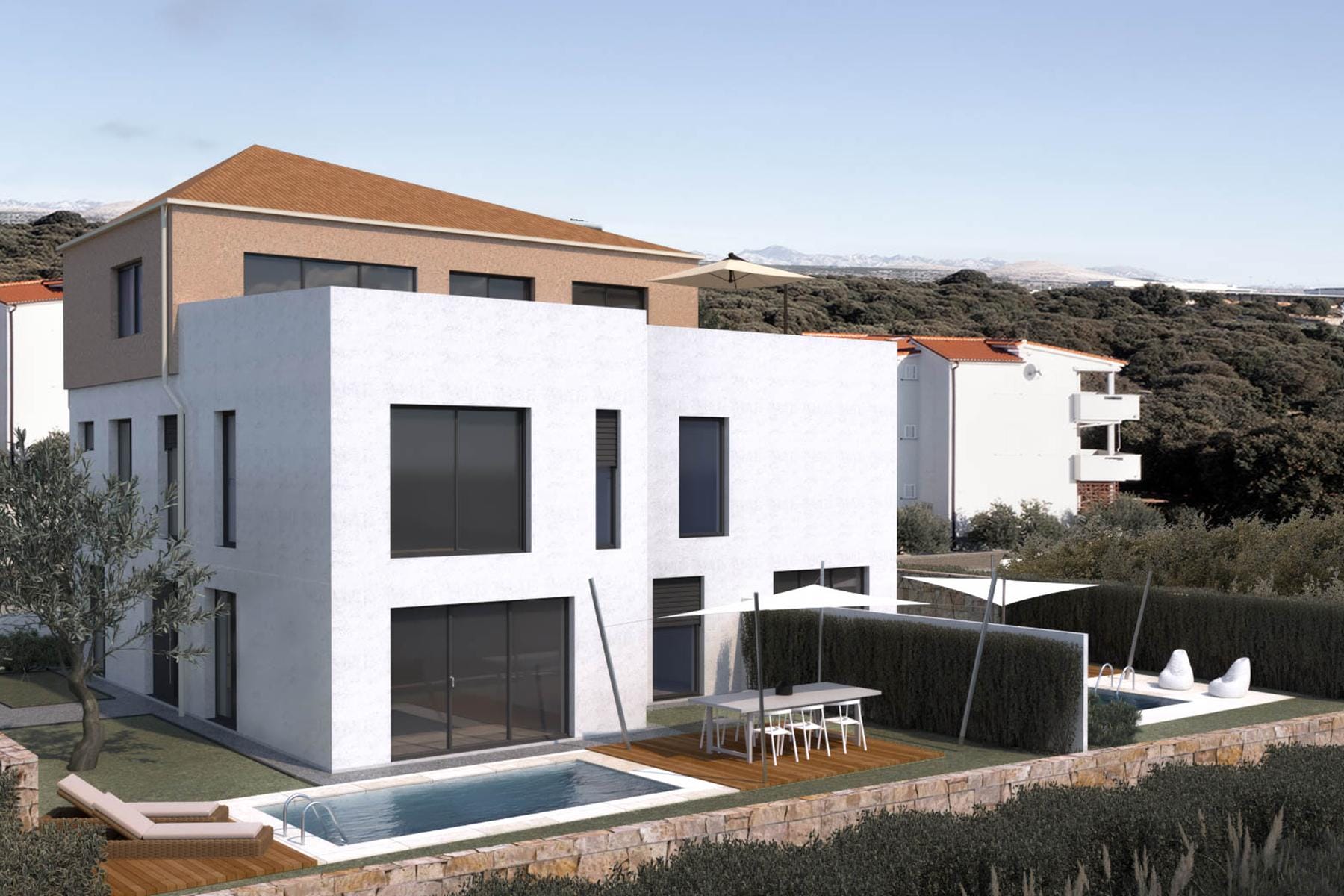 Апартаментът се намира в модерна сграда с четири независими жилищни единици. Инвестицията е разположена в спокойна зона, което гарантира комфорт и уединение за всички жители. Имотът предлага пространство, пригодено за нуждите на двойка или сам човек, а частната градина и басейн са изключителни за ползване от собственика.