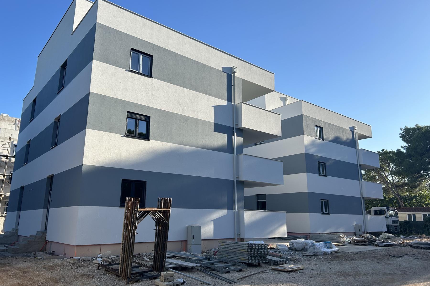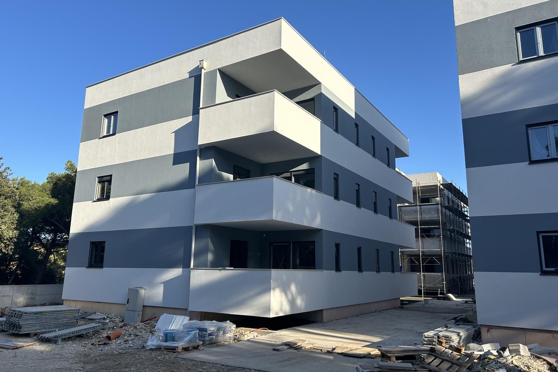Апартаментът се намира в модерна сграда, разположена само сто метра от плажа, което повишава комфорта на ежедневния живот и ваканционния отдих. Сградата се състои от четири сегмента, всеки от които включва по шест апартамента. Цялото е разпределено върху три етажа, което позволява организиране на пространството с мисъл за удобството на обитателите.