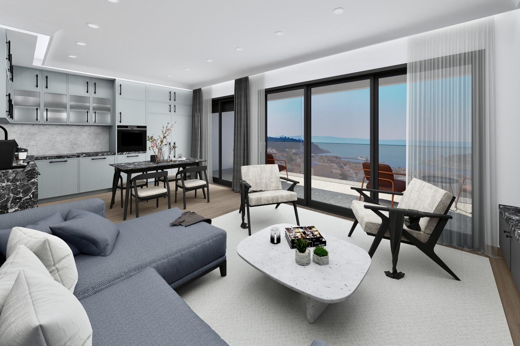 Апартаментът се намира на първия етаж на сграда, разположена на терен с неравномерен наклон, поради което дори помещенията на най-ниското ниво се радват на морска гледка. Интериорът е планиран така, че да осигури максимален комфорт чрез две отделни спални и две бани. Това предложение е идеален избор както за постоянно живеене, така и за инвестиция с цел ваканционен наем.
