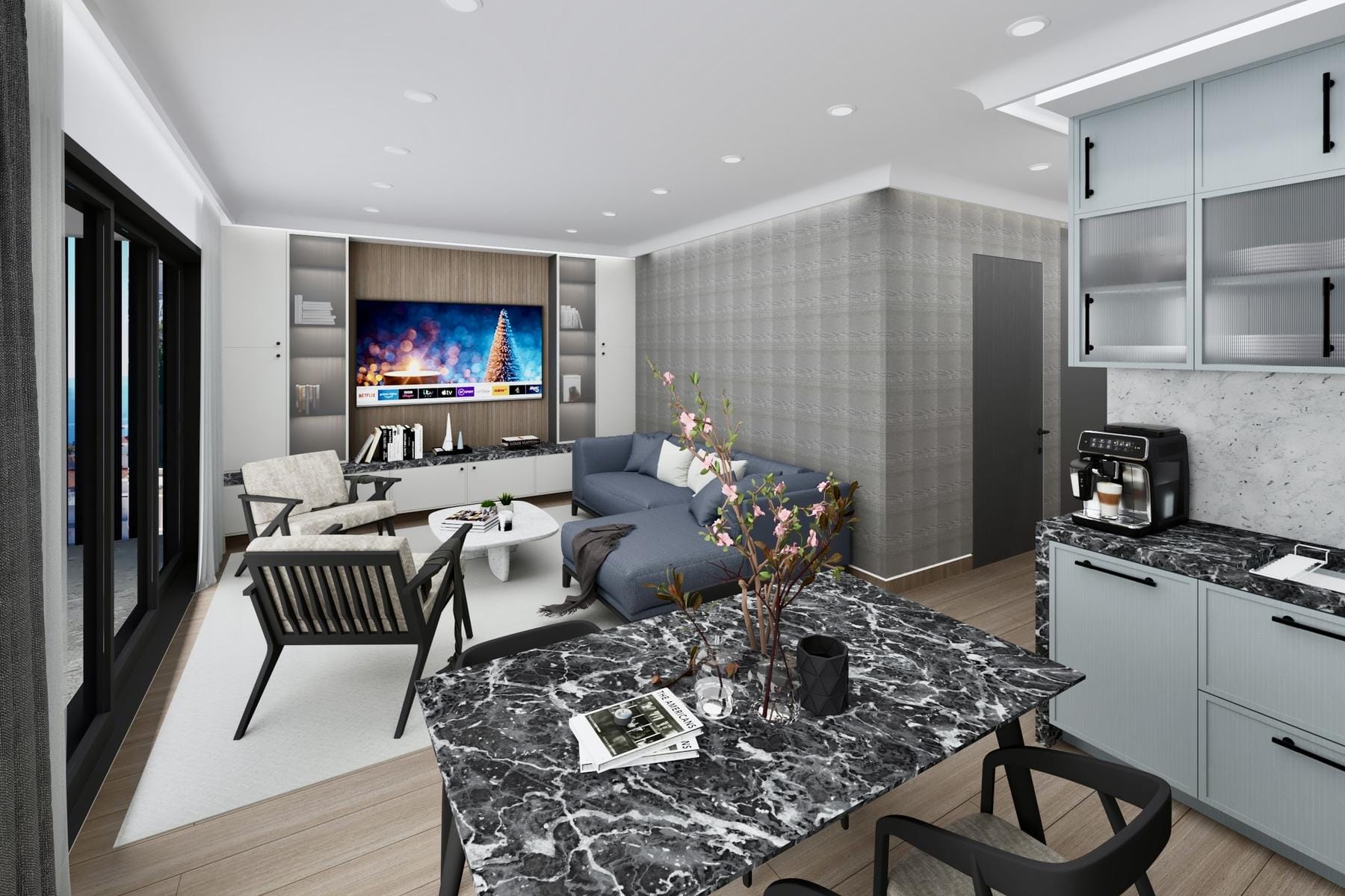 Апартаментът е завършен с внимание към детайла, използвайки висококачествени материали. Просторната дневна е свързана директно с кухнята, създавайки отворено и приветливо пространство. Двете спални осигуряват уединение, а двете бани повишават стандарта на комфорт. Лоджията с внушителни размери приканва към прекарване на време на открито с панорамен изглед.