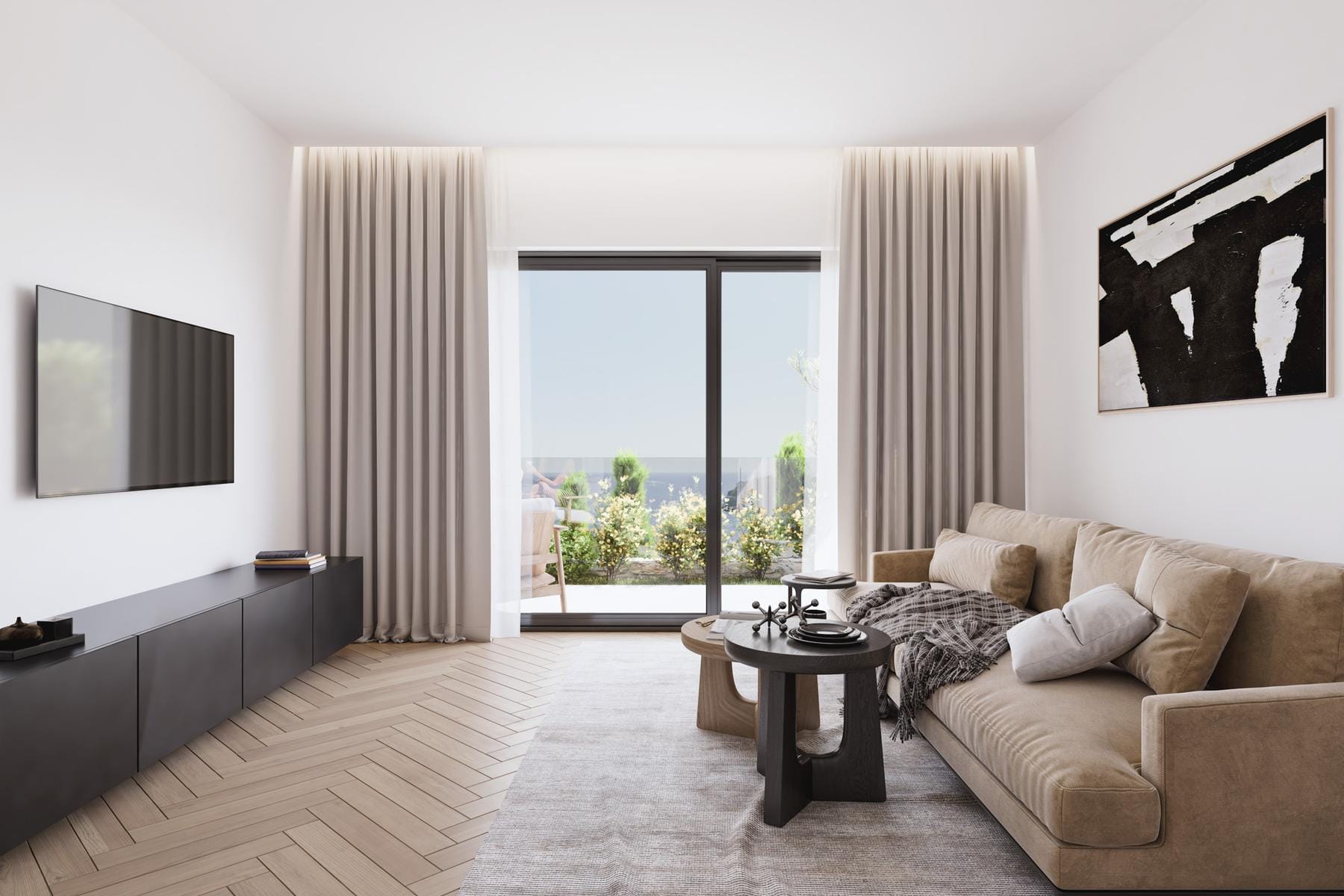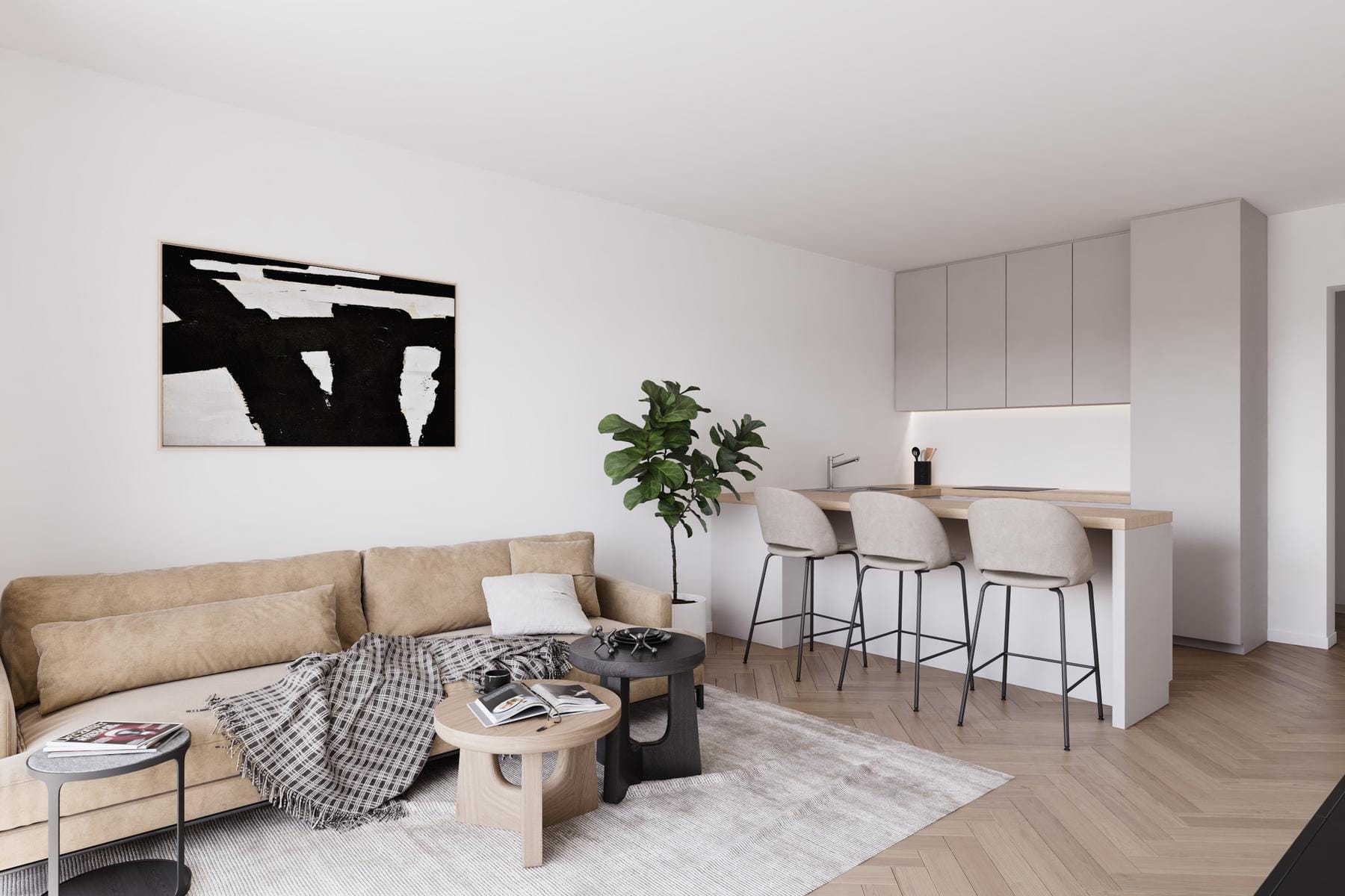 Дневната зона обединява кухнята и хола, което улеснява ежедневното функциониране и насърчава прекарването на време заедно. И двете спални могат да се използват свободно, като се запазва интимността и личното пространство на обитателите. Всяка баня е модерно оборудвана, а довършителните материали отговарят на високи естетически стандарти.
