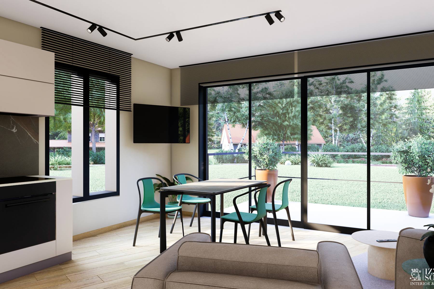 Апартаментът се отличава с функционално разпределение на помещенията. Холът плавно се свързва с трапезарията и кухненския бокс, създавайки удобно място за ежедневен живот. Просторната дневна има изходи към терасата, което придава светлина и връзка с околната среда. В спалнята също има отделен изход към външното пространство, осигуряващ уединение и комфорт. Две бани, като една от тях е оборудвана с практична пералня, увеличават удобството при ползване.