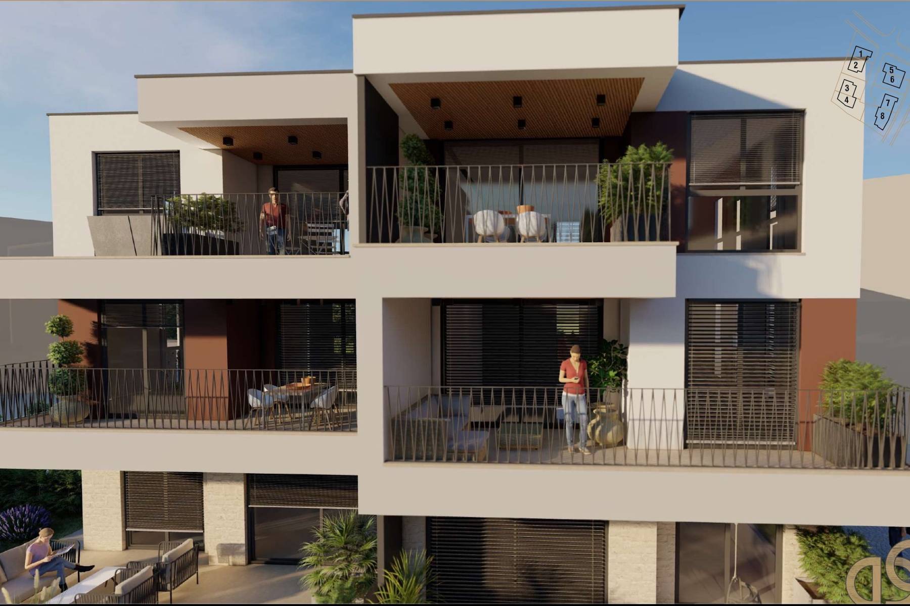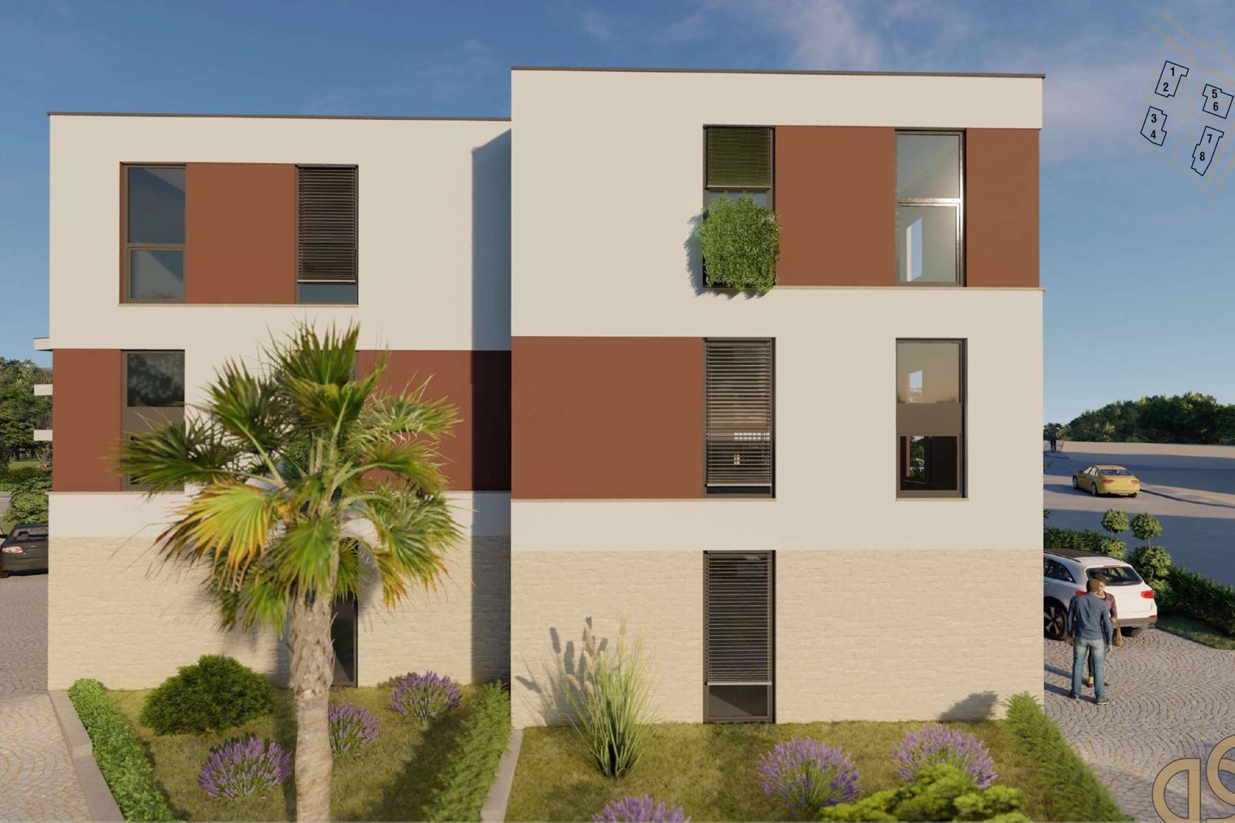 Жилището се намира на партерния етаж на модерна сграда, която е част от интимен жилищен комплекс. Всеки от 10-те блока съдържа само по три апартамента, което повишава комфорта на живот и осигурява уединение. Освен жилищната площ към апартамента принадлежат и практични удобства, които подпомагат ежедневния комфорт.