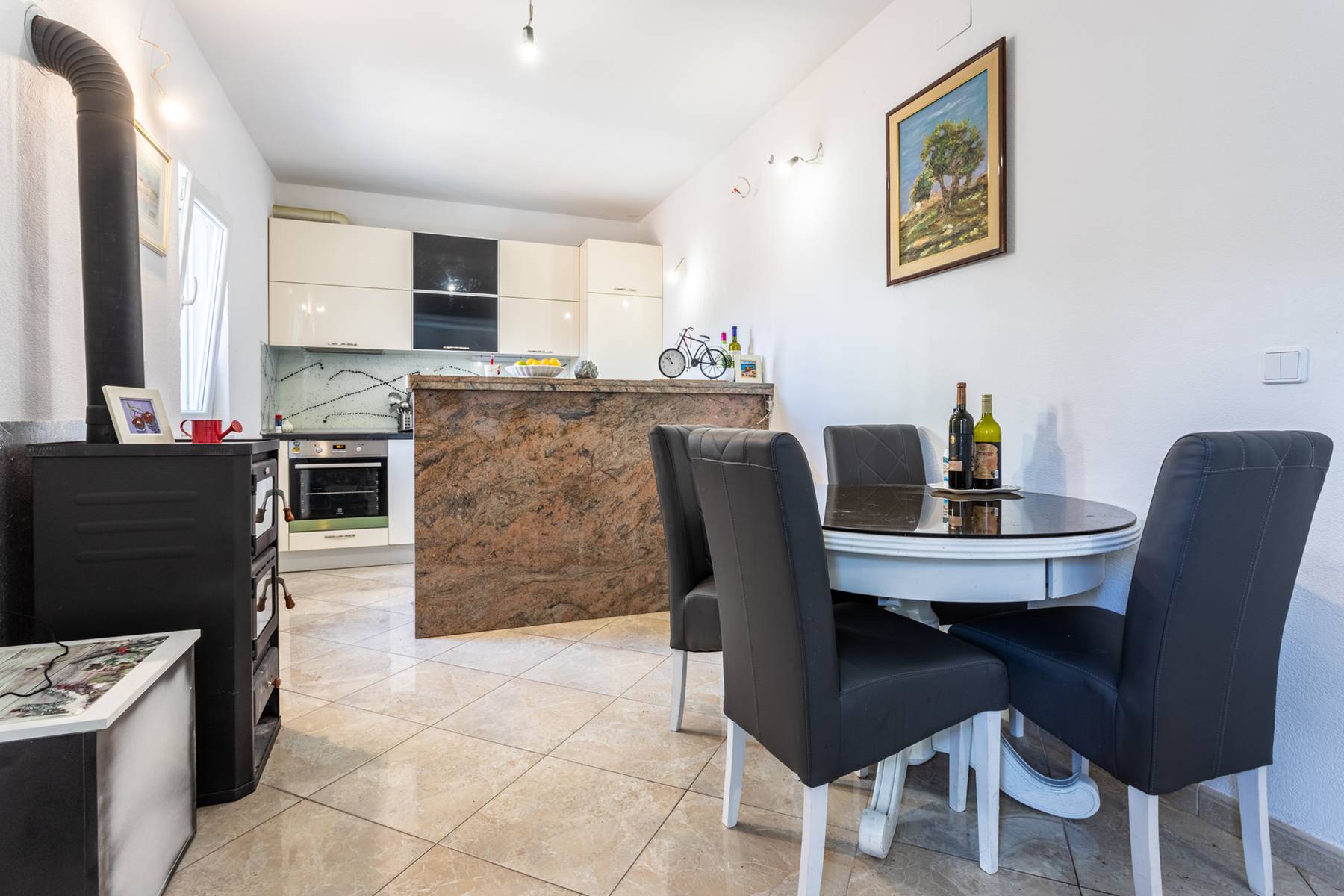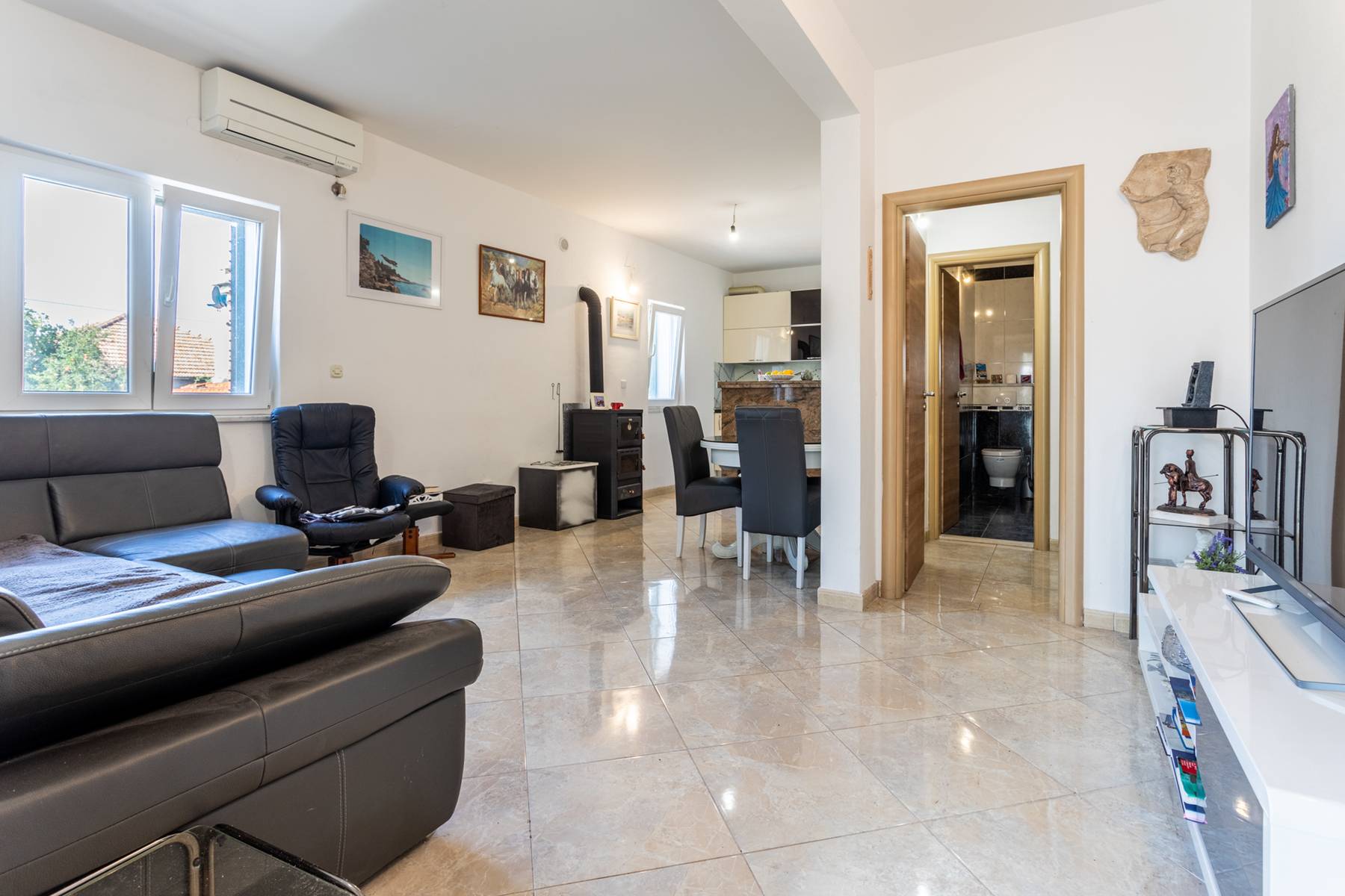Предложението е комфортен апартамент, разположен във Враняч, един от живописните квартали на Солин. Намира се на повдигнат партер в едноетажна сграда, което осигурява добра осветеност и същевременно гарантира уединение. Апартаментът предлага практично разпределение с отворена кухня, свързана с дневната и трапезарията. Две спални и две бани позволяват удобно обитаване за цялото семейство или за двойка, която цени по-голямо пространство.