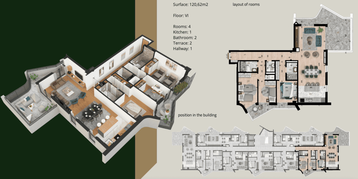 ware, най-висок клас дъбови подове, висококачествени стенни бои, домофон с видеонаблюдение, алармена система, както и климатизация тип сплит-система. Сградата е вечна скулптурна творба на изкуството, отлично разположена на хармонично място, с широкообхватен процес на планиране и проектиране във всеки кубичен милиметър пространство, за да отговори на нуждите на всеки наемател и да го накара да се чувства комфортно всеки ден в новия си дом. Сградата е оборудвана с висококачествена фасада, метални огради на терасите и най-висококачествени материали, налични на пазара. Хармоничните вариации в цветовете и материалите създават разпознаваема идентичност.