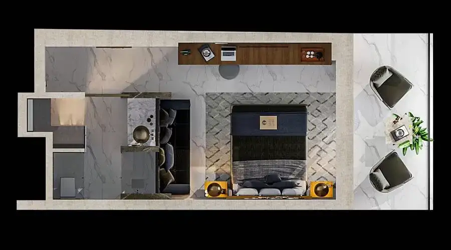 Студиото с площ от 35 м² гарантира пространство, създадено с мисъл за комфорта на ежедневието. Материалите, използвани в довършителните работи, като гранитни плотове и луксозни дървени врати, отговарят на очакванията дори на най-взискателните клиенти.