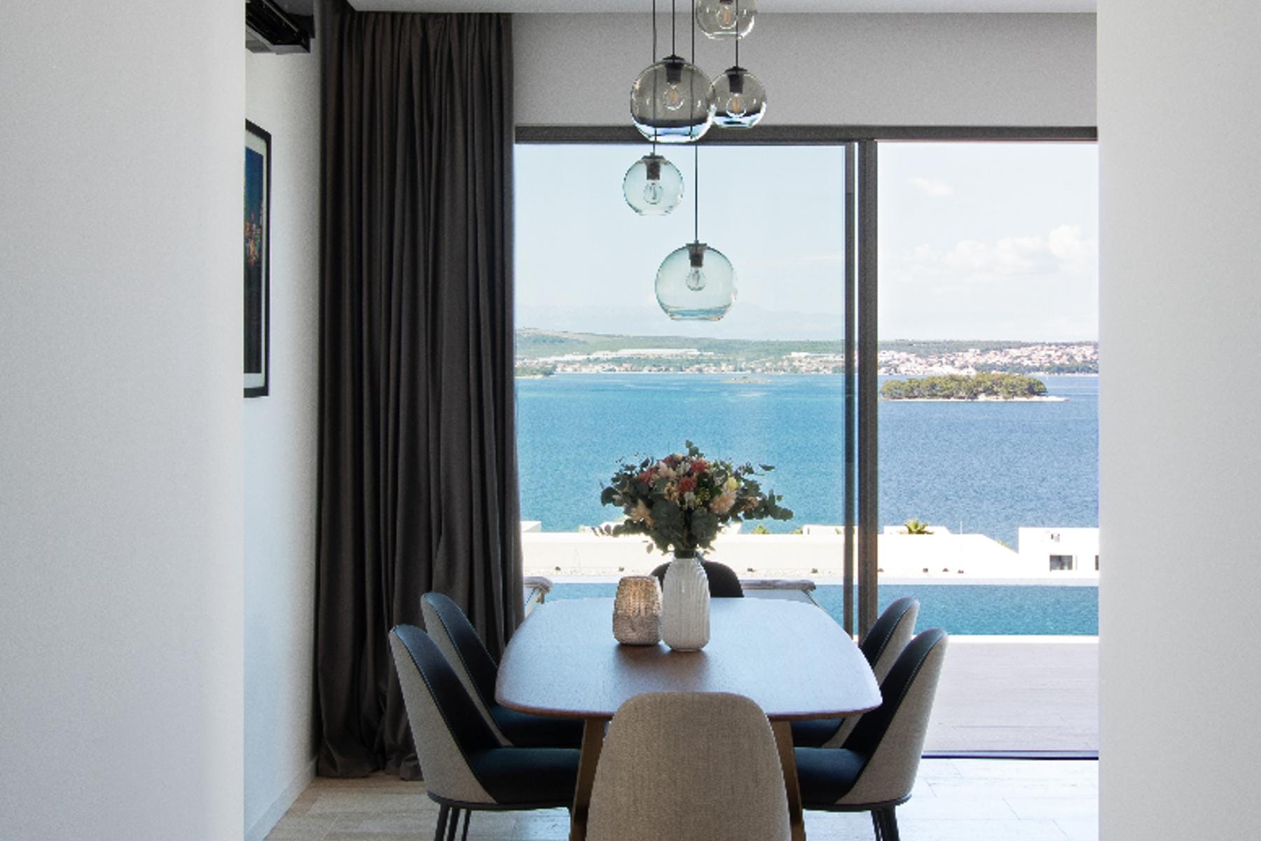 Къщата е проектирана с мисъл за естествената светлина и откритото пространство. Стъклените стени отлично подчертават гледката към морето, а изходът към терасата води директно до частния басейн. Конструкцията и използваните материали при строителството гарантират здравина и удобство при ползване.