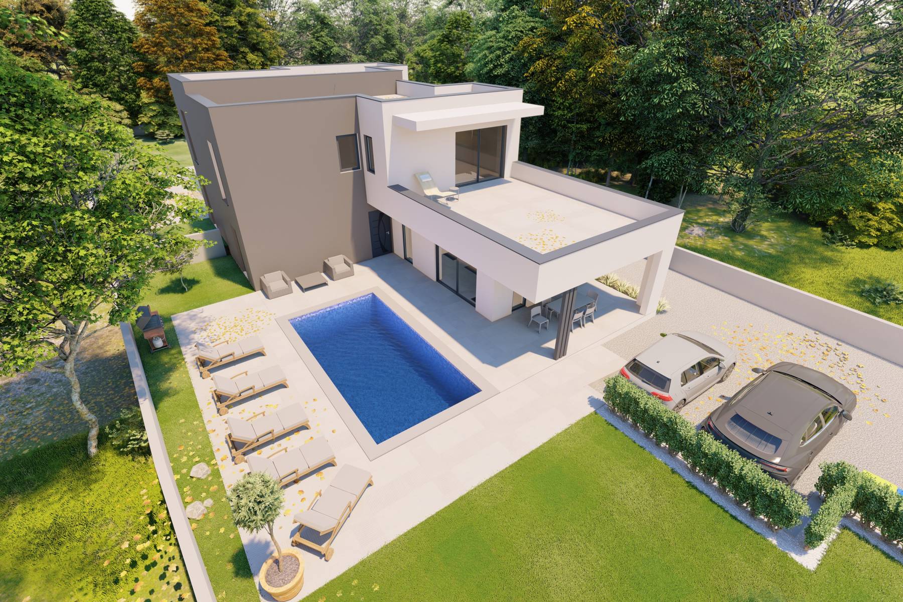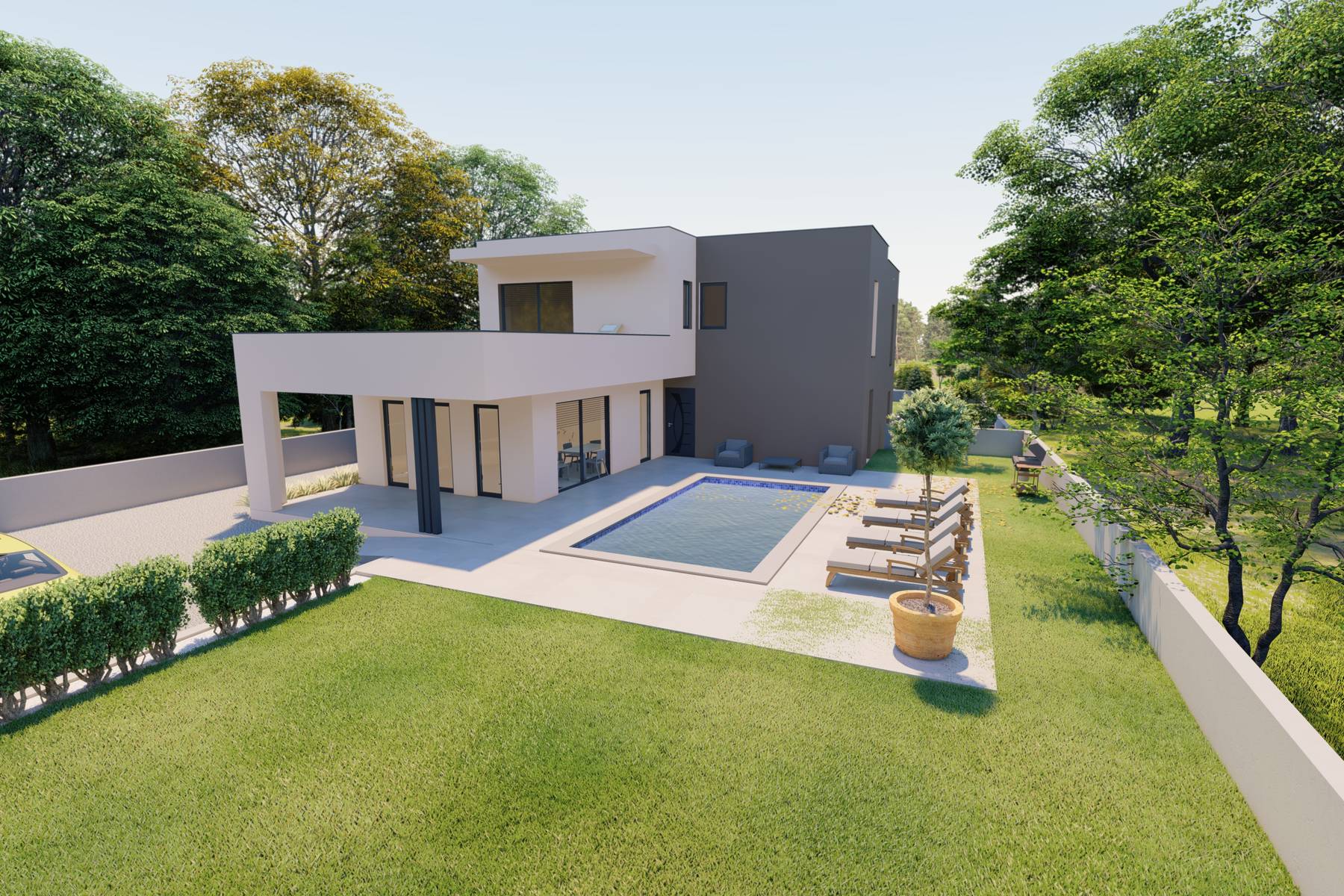 Този комфортен имот съчетава пространство с луксозни решения. Разположението върху парцел с площ 550 м² позволява ползването на частна градина и басейн. Сградата е модерна и просторна, проектирана така, че да максимизира достъпа до естествена светлина.