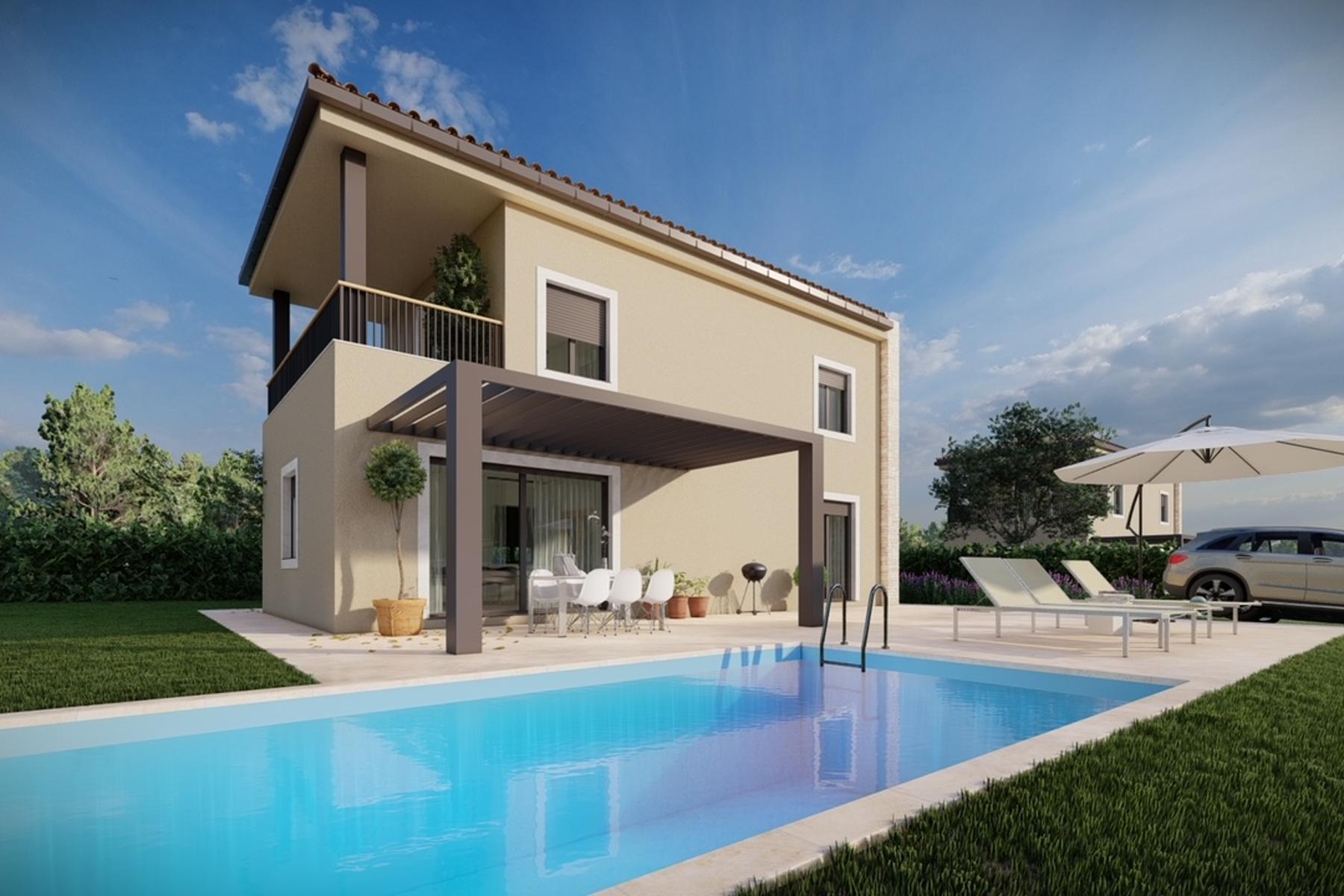 Домът е разположен на парцел с площ 698 м², което предоставя много място за разнообразни градински и развлекателни аранжировки. Архитектурата на дома съчетава модерното с традиционния стил на региона Истрия, което се подчертава от каменната фасада. Интериорите са просторни и светли, осигурявайки комфортни жилищни условия. Чистите линии и функционалното разпределение на помещенията способстват за удобно използване на имота както в ежедневието, така и при семейни събирания.