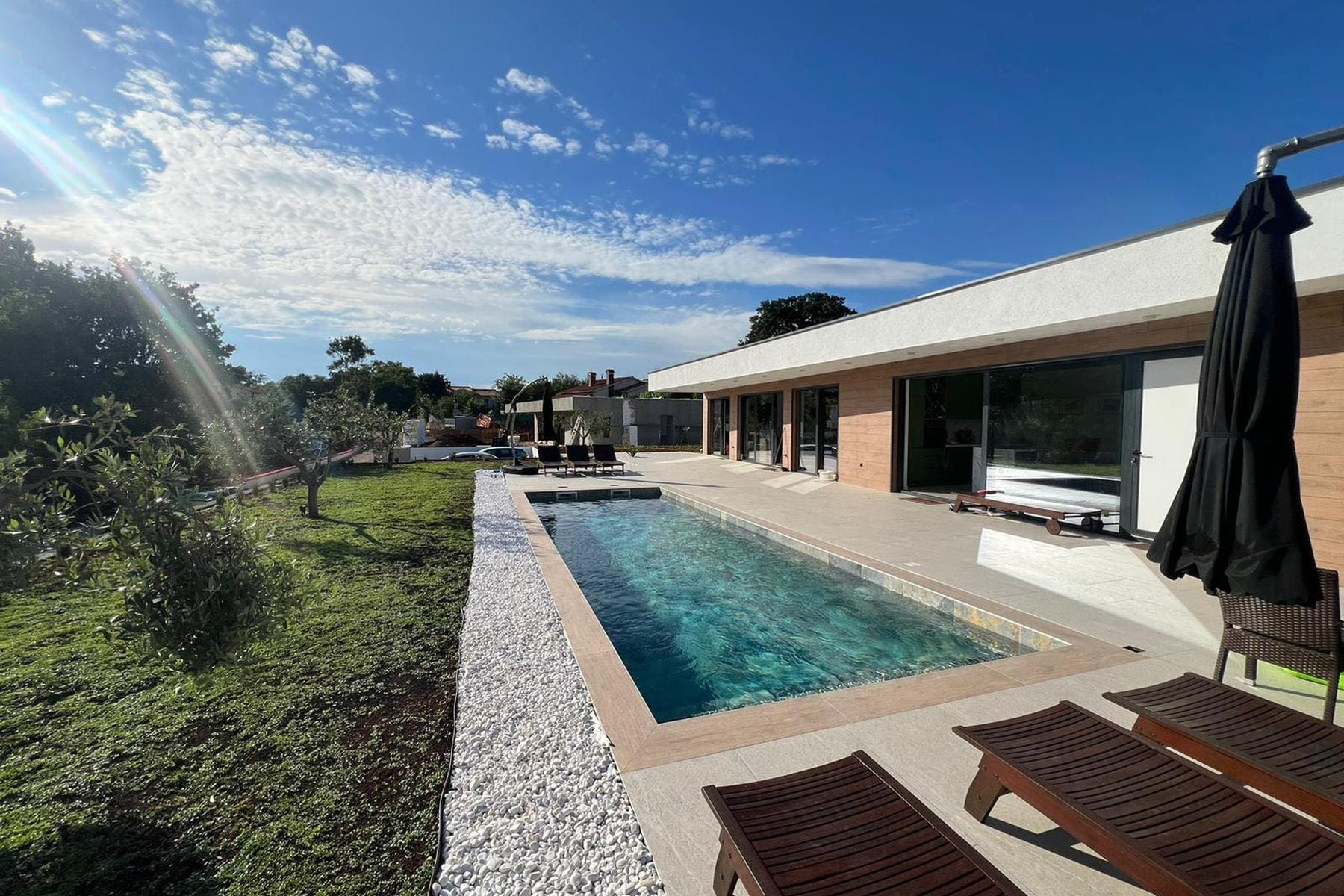 Просторен, едноетажен дом, разположен непосредствено до границата на застроена територия в покрайнините на живописния град Лабин. Около него има зеленина и нискоетажна жилищна застройка с фамилни къщи и ваканционни къщи, което осигурява спокойствие и уединение. Модерната архитектура и високият стандарт на изпълнение правят тази недвижимост изключително предложение за хора, търсещи комфортно място за живеене или отдих. Площта на дома позволява удобно живеене, предлагайки два независими жилищни обекта.