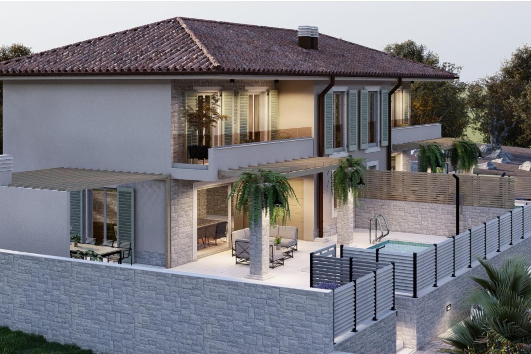 На горния етаж има три спални със собствени бани, което осигурява уединение на всеки член на домакинството. Недвижимостта се отличава и с наличието на басейн – идеално място за релакс през топлите дни. Околността с нови къщи и вили повишава престижността на локацията и осигурява интимна атмосфера.