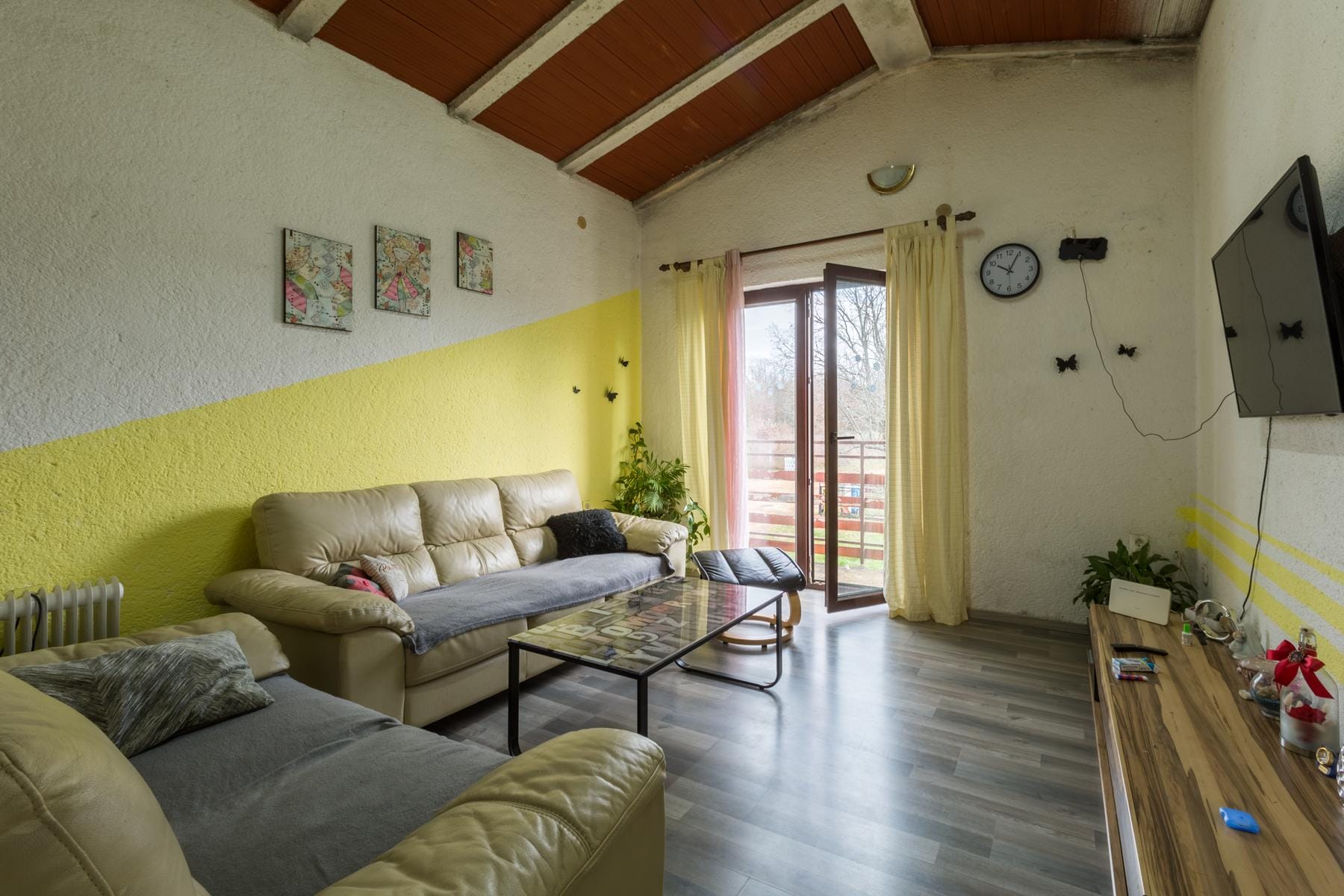 Апартаментът на приземния етаж е оборудван със спалня, кухня, баня и помощно помещение, което осигурява самостоятелност и комфорт. Горният етаж разполага с по-голяма жилищна площ, позволяваща свободно обитаване от повече хора. Ограденият парцел осигурява безопасно място за деца и домашни любимци. Голямото пространство навън предлага много възможности за развлекателно или градинарско облагородяване. Близостта до път с бързо движение улеснява ежедневните пътувания до работа или училище.