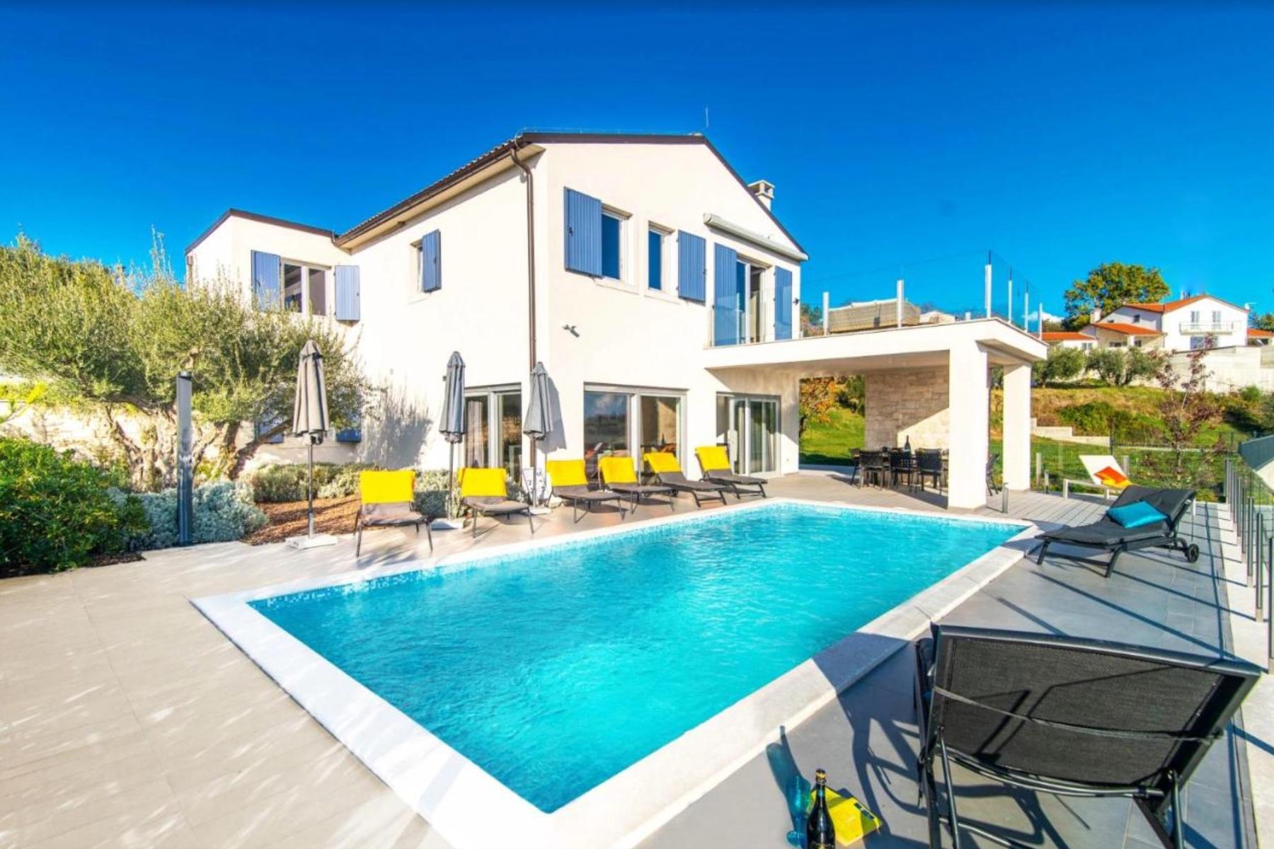 Вилата, разположена на хълм в град Буе, предлага уникална възможност за живот в спокойно и очарователно място с красива гледка към Адриатическо море и околните планини. Имотът се намира на парцел с площ над 600 м², което осигурява комфорт на пространството и уединение. Интериорът на дома е проектиран с мисъл за функционалност и естетика, предлагайки светли и добре осветени помещения. Големите прозорци позволяват да се наслаждавате на панорамата на Истрия, която впечатлява с гледката си към т.нар. истрийска Тоскана.