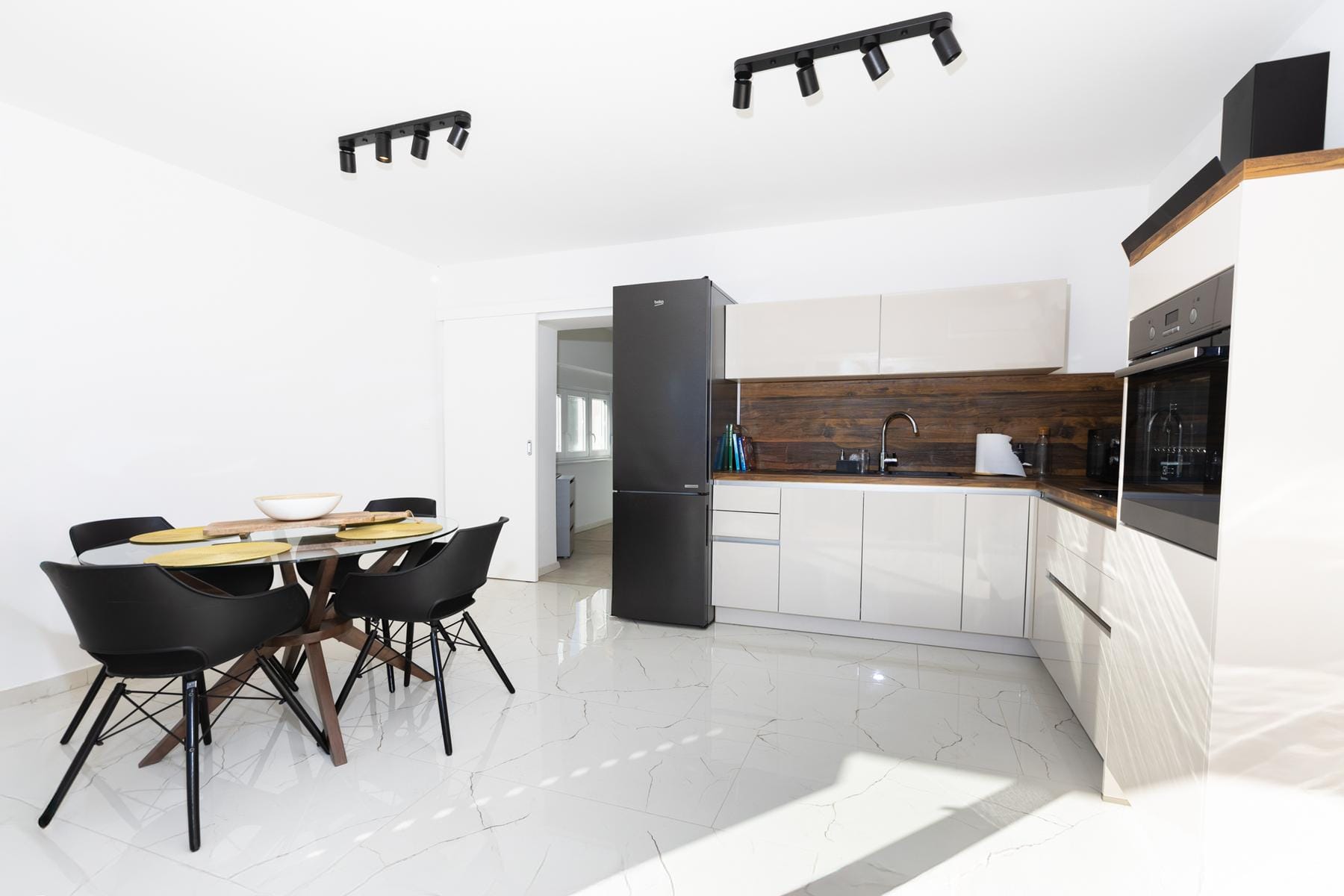 Интериорът на къщата е проектиран така, че да използва максимално естествената светлина чрез големи остъклени повърхности. Дневната зона обединява кухнята с трапезарията и хола, създавайки общо пространство, идеално за срещи и релакс. Това място е особено препоръчително за хора, които ценят контакта с природата, както и за тези, които търсят спокойствие и близост до морския климат.