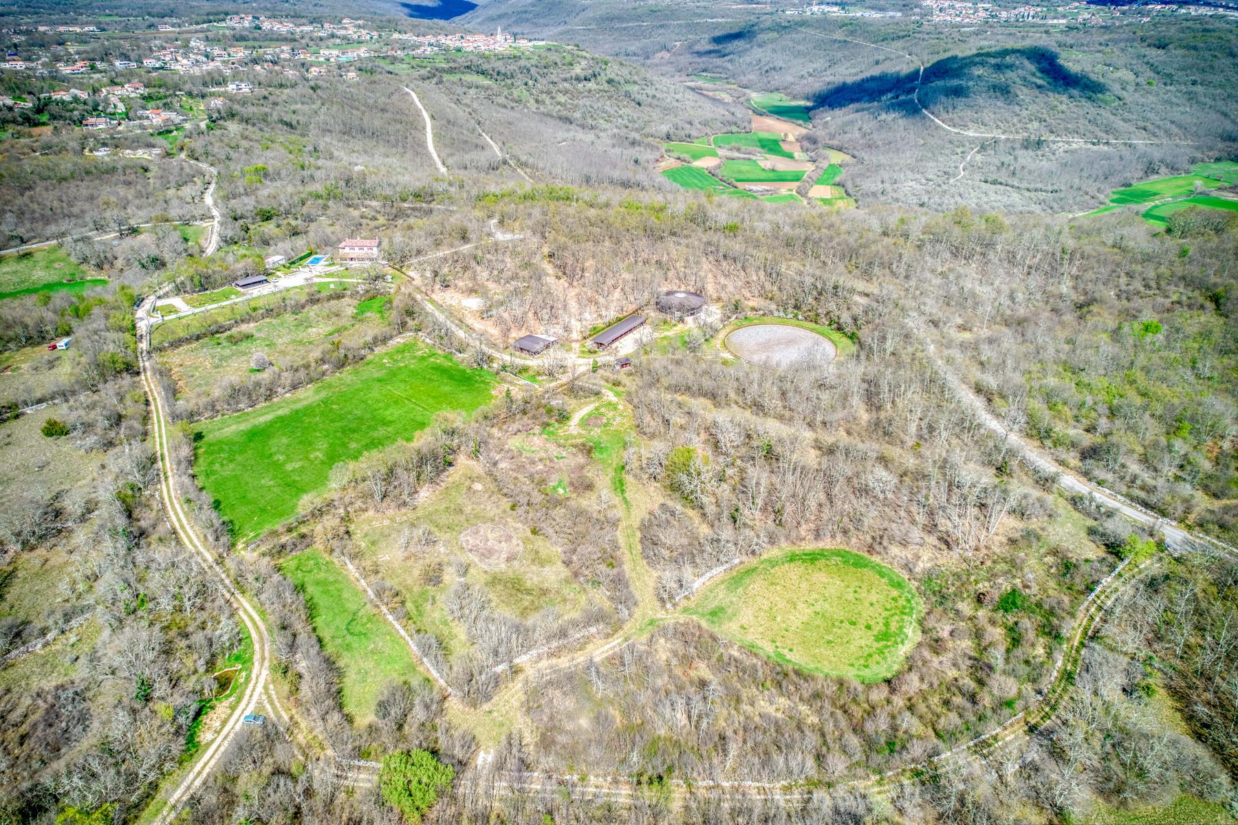 Парцелът с впечатляваща площ от над 4 хектара включва обширни ливади, гори и специализирани конни съоръжения. Това място е отлично за любителите на конете и за тези, които търсят спокойно убежище далеч от градския шум. В имота има и басейн, който позволява релакс в горещите дни.
