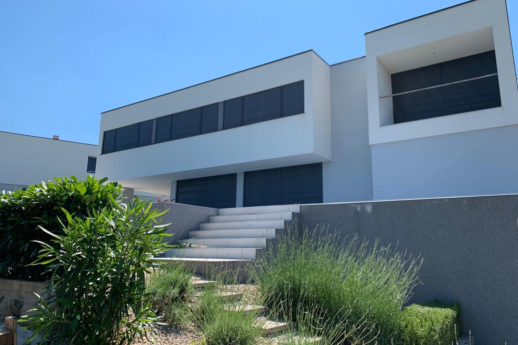 Вилата разполага с просторни интериори с много естествена светлина, което подчертава нейния модерен характер. Кухнята с трапезария не са отделни помещения, а плавно се свързват с хола, създавайки открито и приветливо пространство. Разпределението на къщата и големите остъкления позволяват да се наслаждавате на живописните гледки почти от всяко помещение. Парцелът е заобиколен от зеленина, което увеличава уединението и допринася за спокойствието.