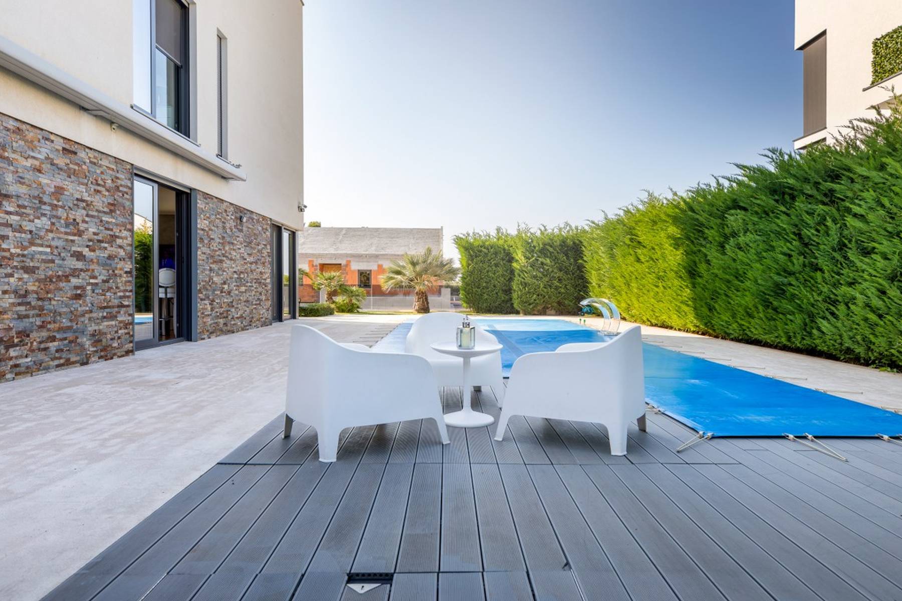 Тази престижна вила се намира на парцел с площ от 642 квадратни метра, което дава възможност за релакс на открито в частно пространство. Сградата с обща полезна площ от 260 квадратни метра е проектирана така, че да използва максимално всеки квадратен метър. Комплексно оборудваните помещения и многобройните удобства гарантират комфортен начин на живот.