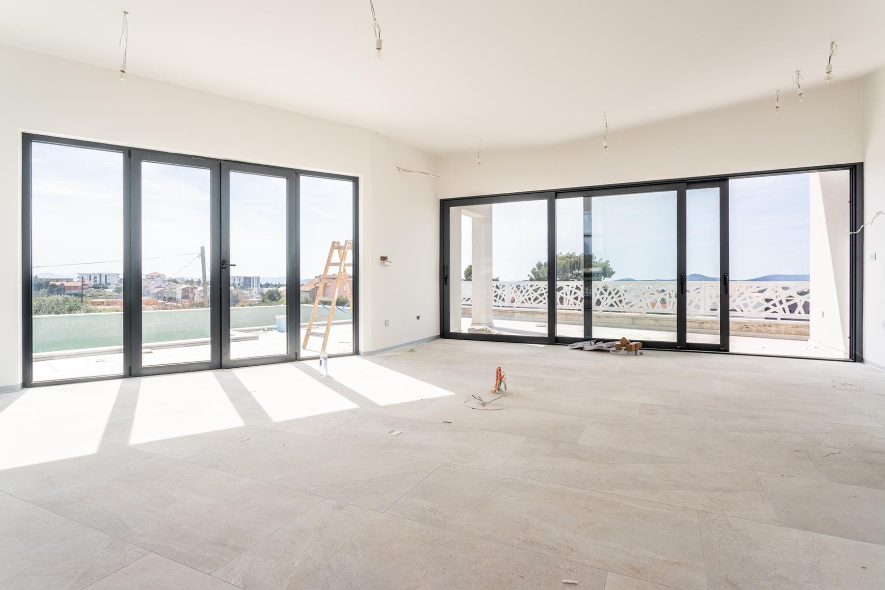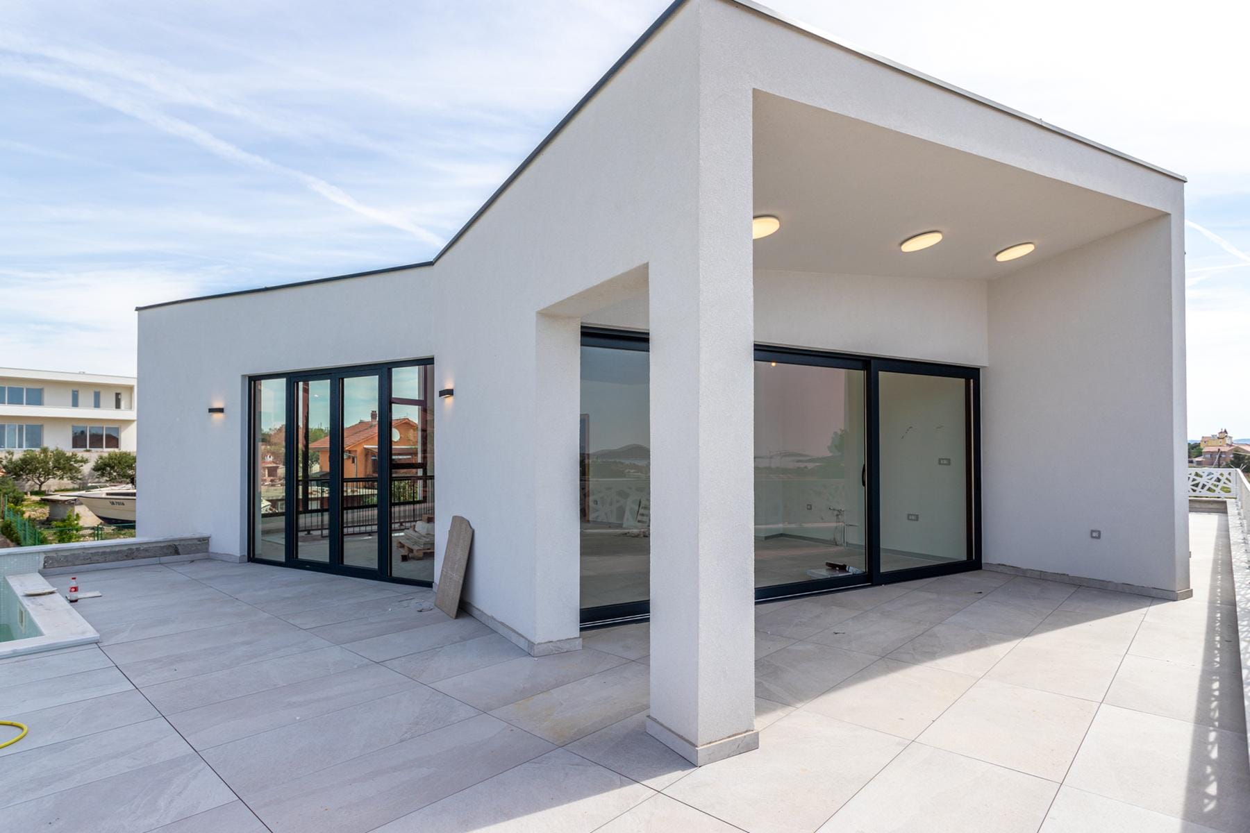 Големите алуминиеви прозорци осигуряват отлична осветеност на помещенията и приканват да се насладите на красотата на морската гледка. Интериорът е в светли тонове, подчертаващи съвременния стил. Зад къщата има функционално техническо помещение, в което могат да се поставят устройства за обслужване на басейна.