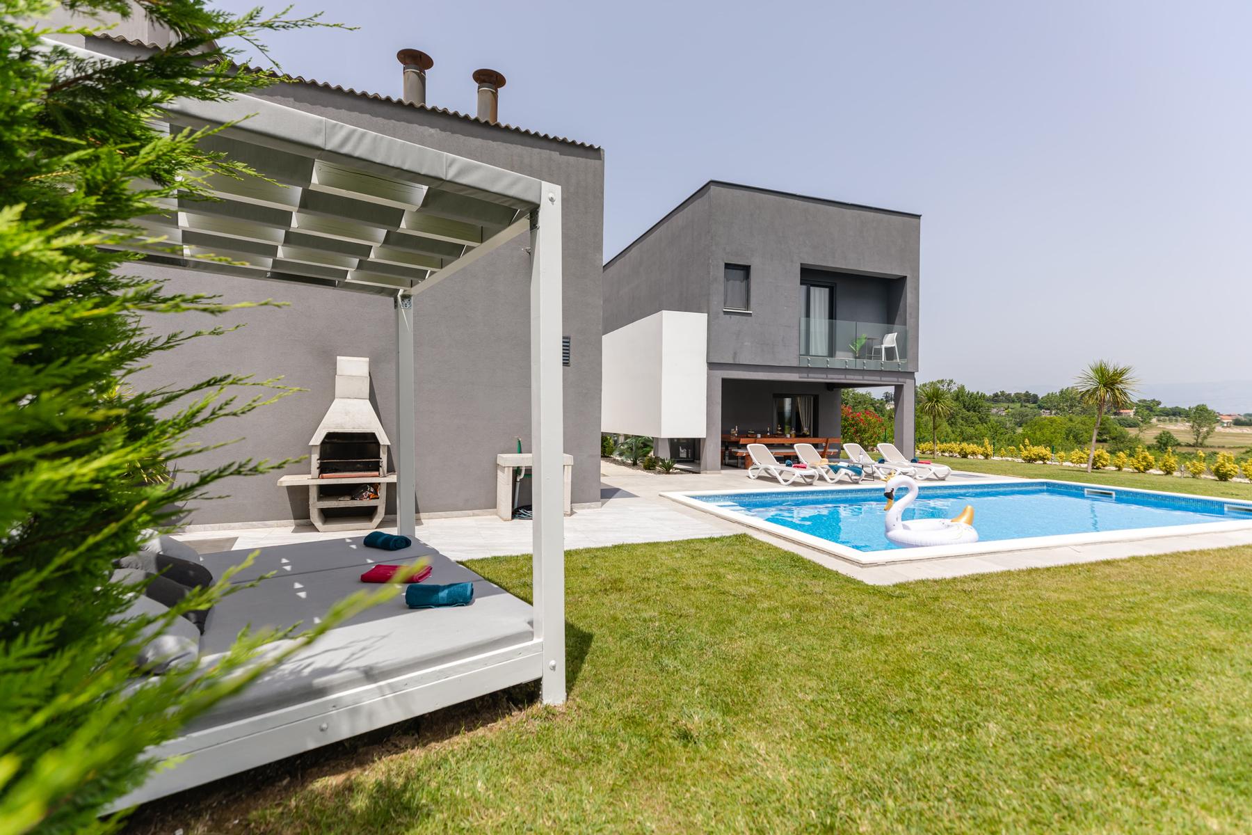 Външното пространство представлява добре поддържана градина с басейн, който е подходящ през горещите дни. Голямата площ на парцела позволява организиране на зона за релакс или спортни активности. Локацията повишава стойността на инвестицията поради спокойната околност и лесния достъп до удобствата в района.