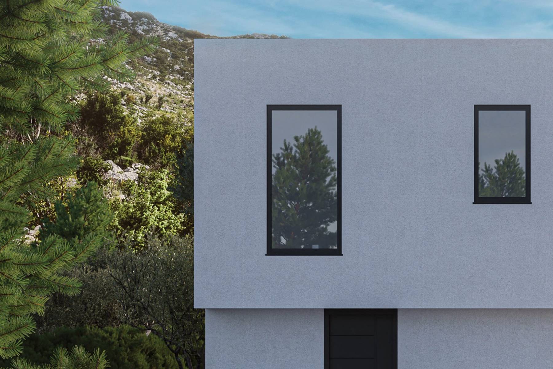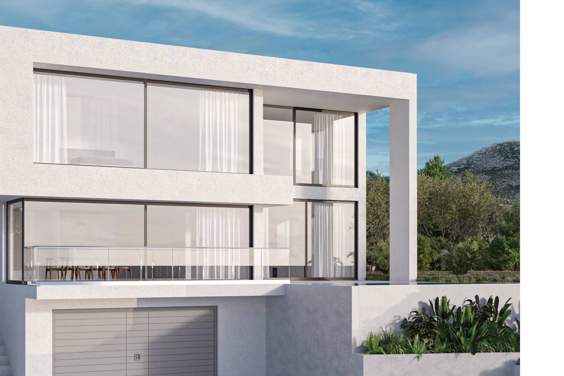 На нивото на мазето се намира просторен гараж за два автомобила и стопански помещения, включително фитнес зала. Партерът е дневната зона с лесен достъп до терасата и градината. Етажът включва частни стаи и бани, осигурявайки почивка в пълно уединение. Инфинити басейнът, запълващ пространството на градината, не е само място за релакс, но и стилен архитектурен елемент отвън.
