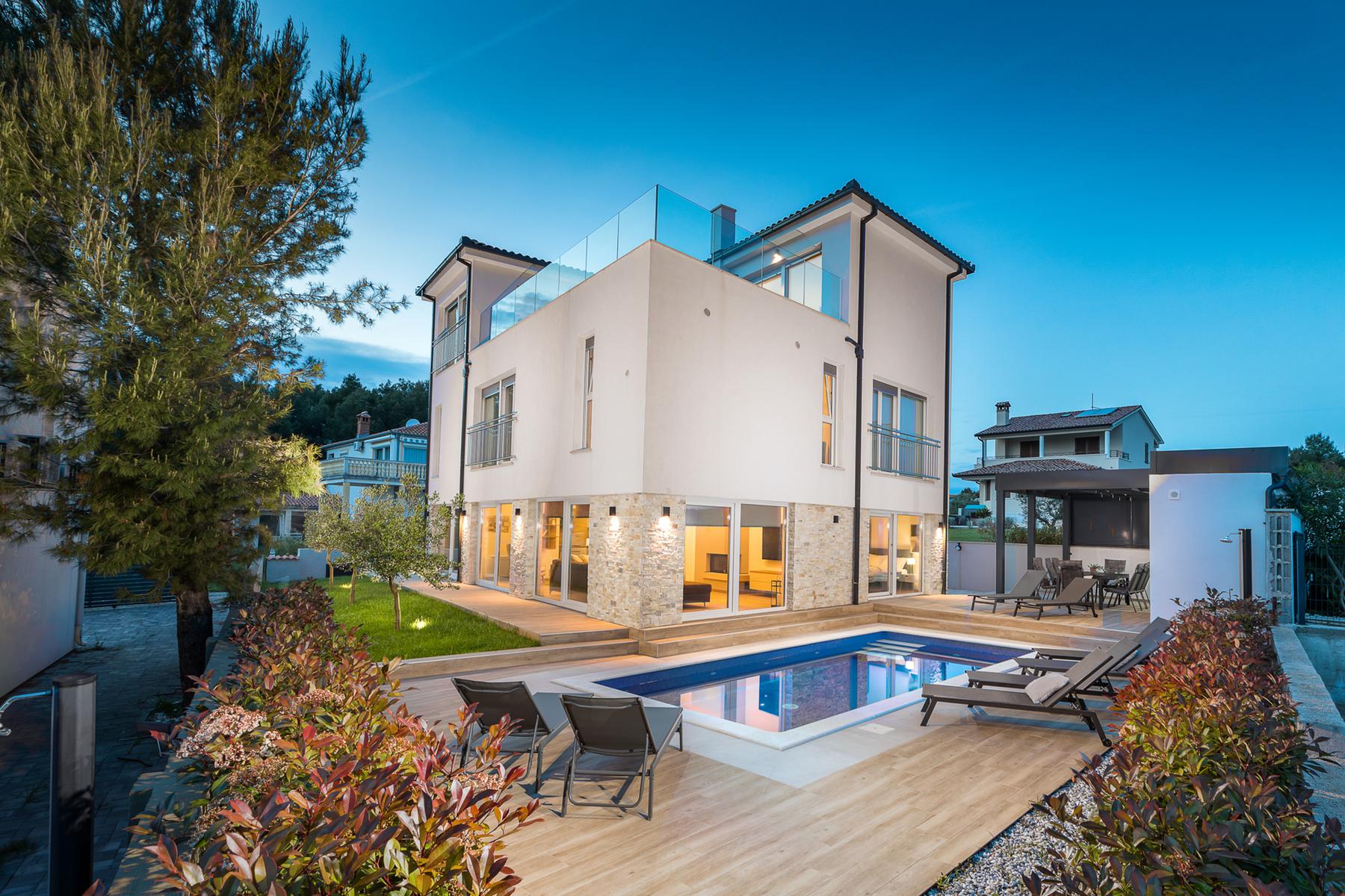 Изключителният имот се намира в едно от най-живописните населени места в Истрия. Имотът е разположен само на 700 метра от морския бряг и внимателно проектираните плажове. Тази просторна вила с площ от 360 м2 е проектирана с мисъл за удобство и висок стандарт на живот. Сградата се простира на три етажа, които са обзаведени според най-новите тенденции в архитектурата.