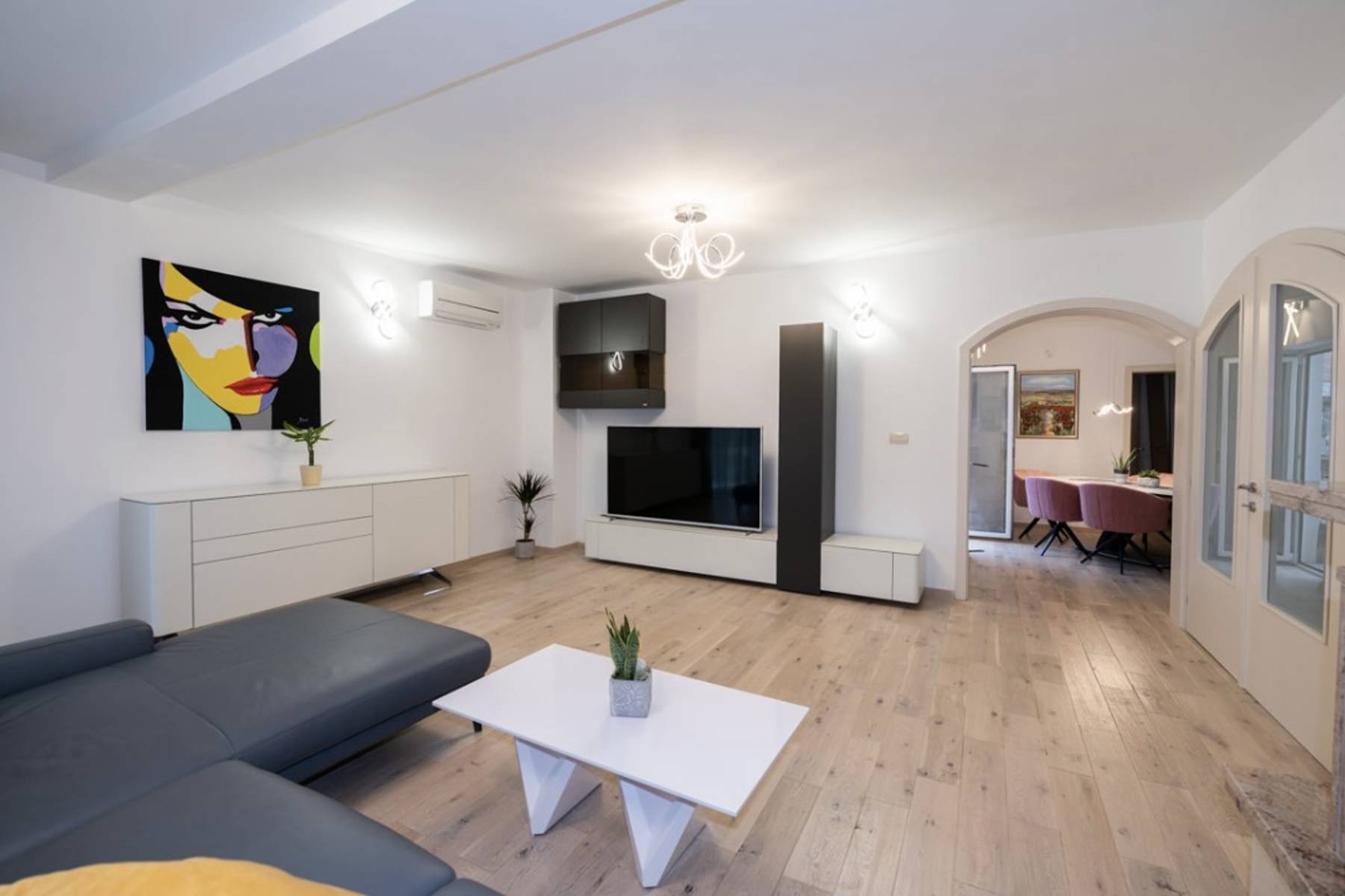 В сърцето на териториите зад Опатия, в селището Матуле, се намира изключителна вила, обзаведена в модерен стил. Сградата гарантира отлични условия за живот и тишина, която търсят взискателните клиенти. Комфортните интериори са проектирани с мисъл за поверителността и удобството на цялото семейство. Имотът се състои от подземен етаж, партер и два жилищни етажа с две жилищни единици, което създава възможност за гъвкаво използване на пространството. Изключително предимство е просторният гараж и помощните помещения, разположени в подземието. Всяко от помещенията е изпълнено внимателно, с особено внимание към функционалността и естетиката.