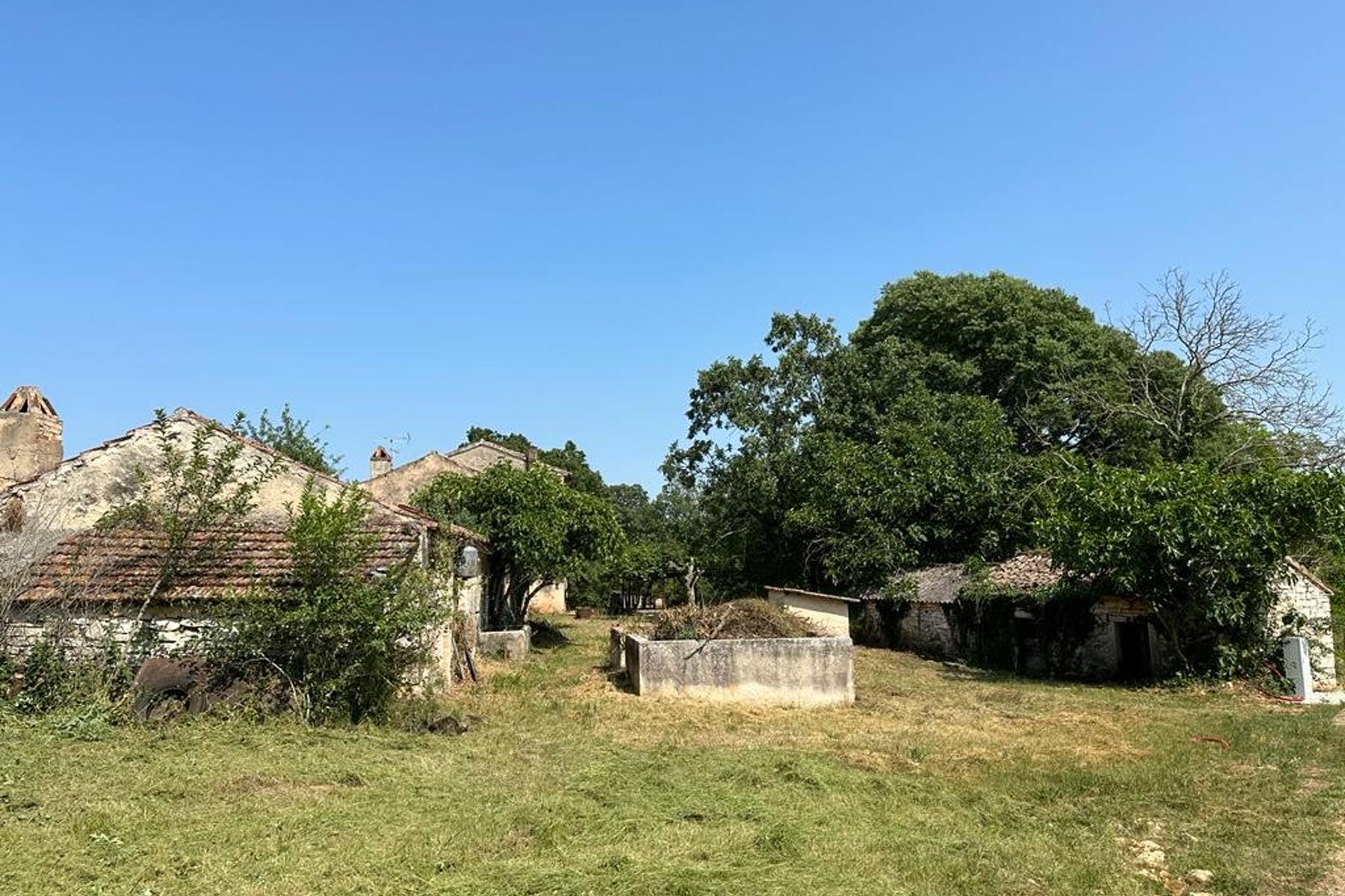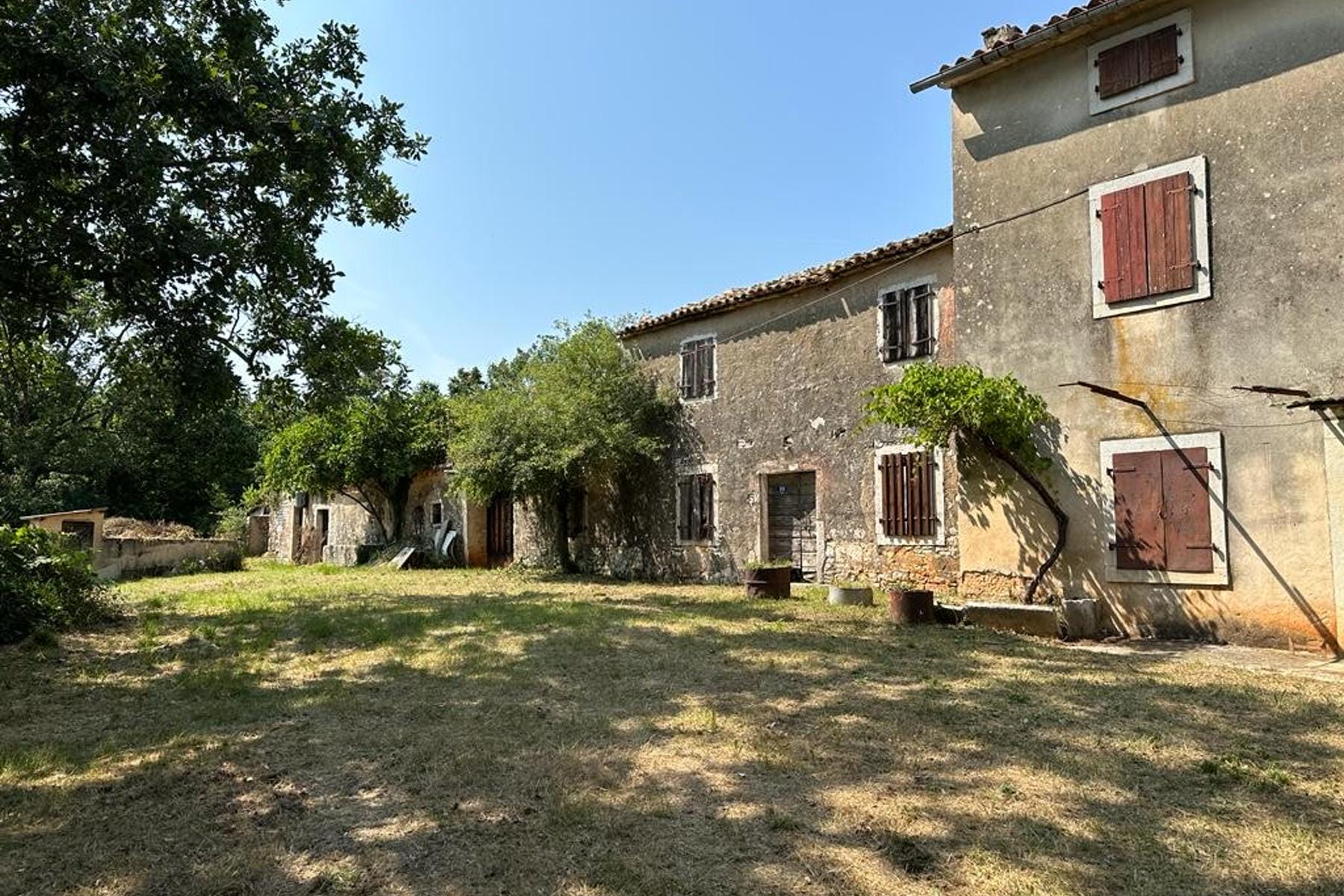 В живописния район на Истрия се намира уникален имот, който представлява отлична база за инвестиция или частен оазис. Този обширен имот обхваща цели 90 хиляди квадратни метра, сред които са разположени три автентични каменни къщи с обща площ над 600 квадратни метра. Сградите се нуждаят от модернизация, което дава възможност за свободно оформление на интериора според личните нужди. Част от парцела с площ 2 хиляди квадратни метра е в строителна зона, което позволява развитие на инфраструктура и реализиране на различни проекти. На територията на имота има налични комунални услуги като електричество и вода, което улеснява планирането на бъдещи дейности. Освен това, обширният терен включва земеделски земи, гори и много ценни обработваеми полета.