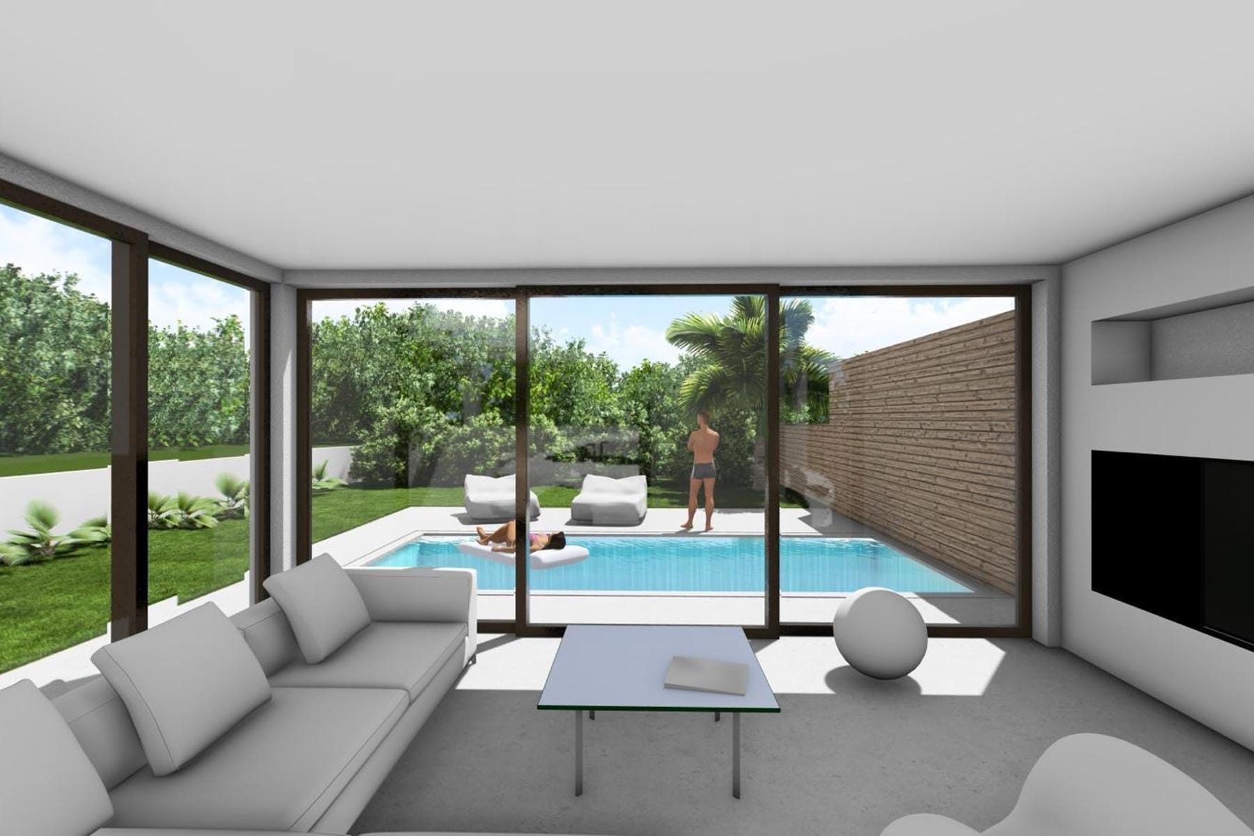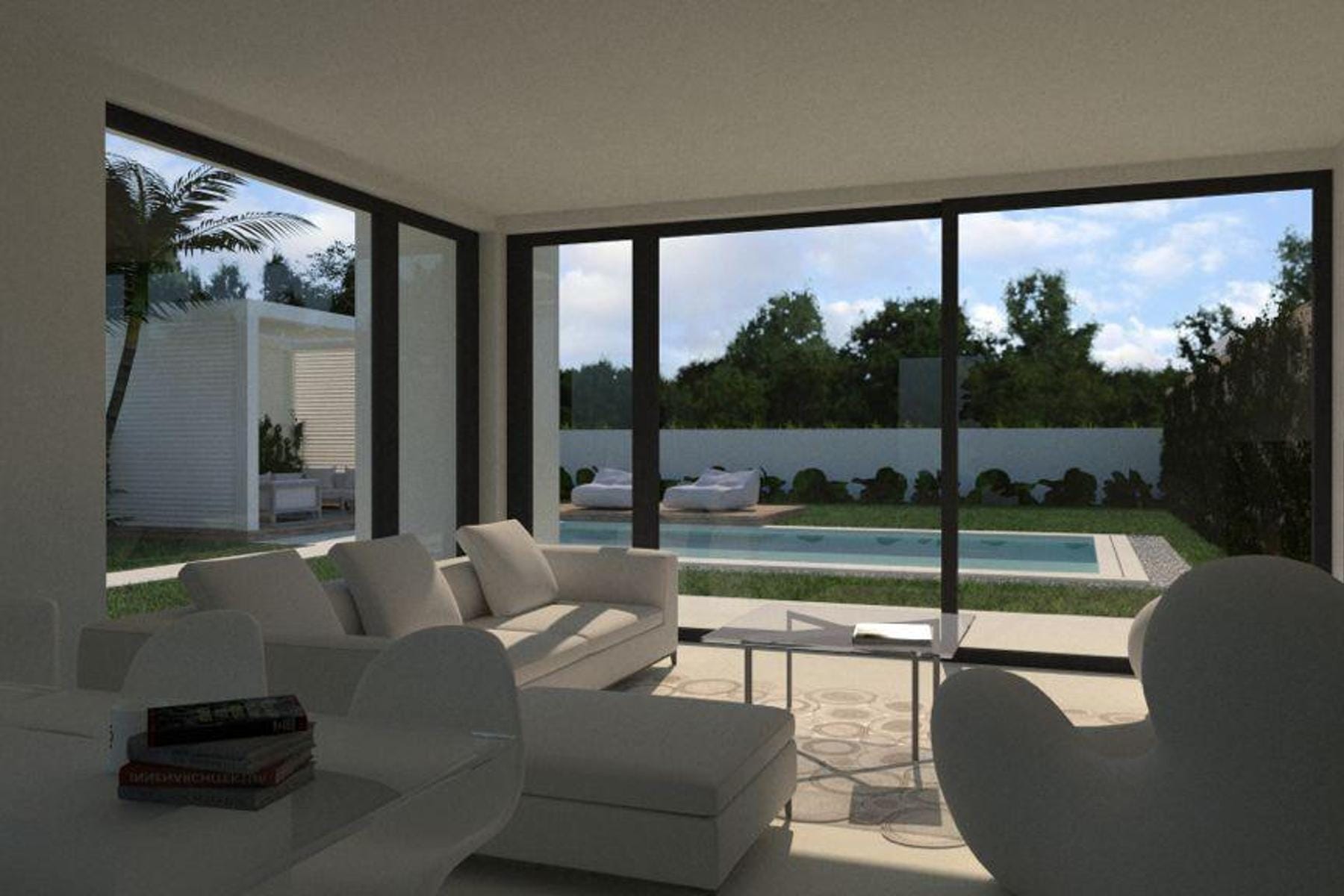 Цялото е разположено на частен парцел с площ малко под 400 м², което осигурява комфорт и усещане за уединение. Околността с много зеленина и басейн, видим от дневната, създават атмосфера, благоприятстваща релаксацията. Тази къща е отлична възможност за хора, които искат да се наслаждават на живота в климатa на Южна Европа, без да се отказват от модерни решения и удобства в ежедневието.