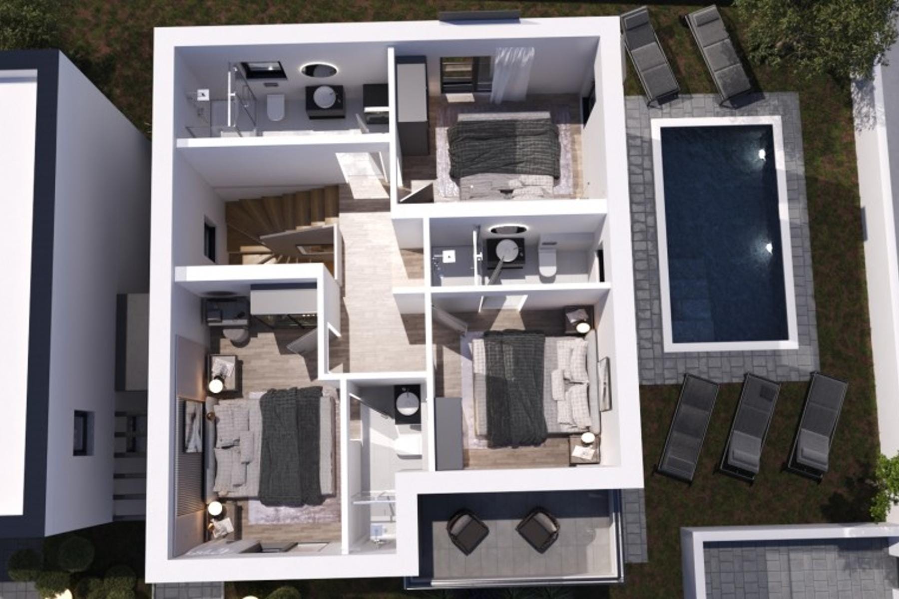 Горният етаж предлага три стаи и три бани, които подпомагат комфорта дори при по-голямо семейство. Всяко помещение е проектирано с мисъл за естетика и практичност. Къщата се отличава с високо качество на довършителните работи и модерни инсталации. Благодарение на големия брой бани домът осигурява свобода при ползване.
