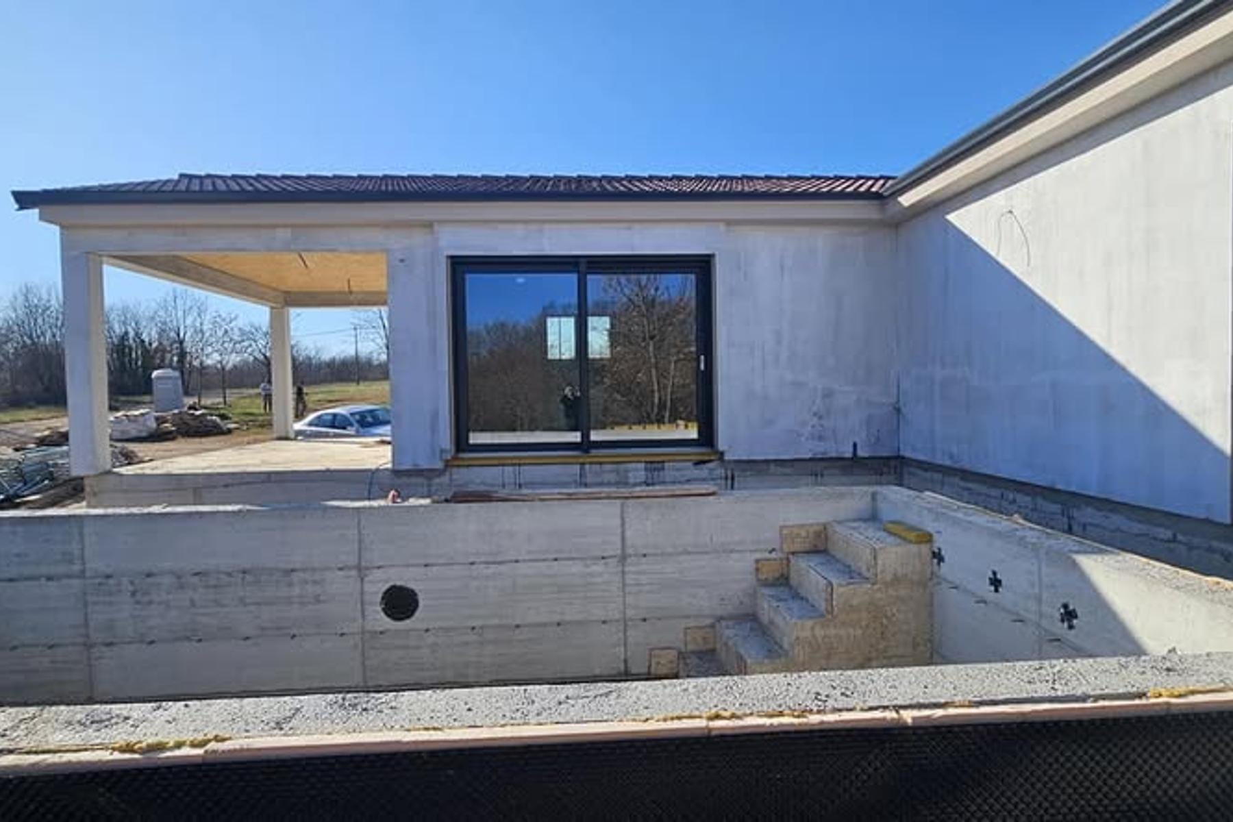 Домът разполага с просторен басейн с площ 32 м², идеален за релакс и отдих в топлите дни. В момента имотът е наличен в груб строеж със затворена конструкция, но съществува възможност за завършване „до ключ“ според индивидуалните нужди на бъдещите собственици. Това е отлична оферта за хора, търсещи модерен дом близо до природата с лесен достъп до градската инфраструктура.